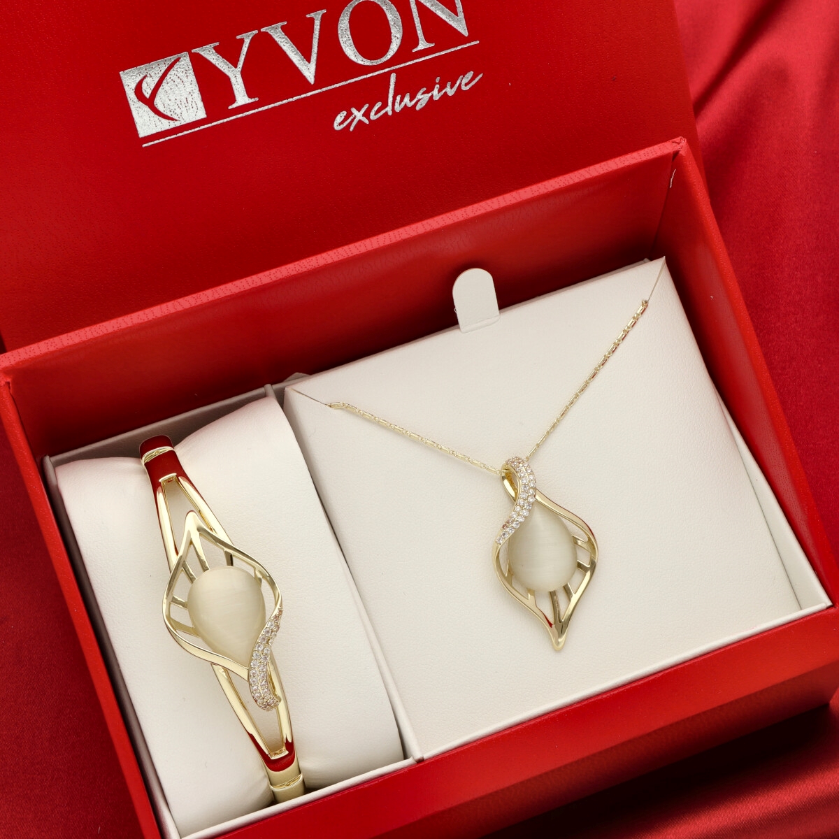 Naszyjnik i bransoleta tworzą spójny, harmonijny komplet, idealny do eleganckich stylizacji i wieczorowych zestawów. Każdy zestaw pakowany jest w duże, ekskluzywne pudełko prezentowe YVON, zaprojektowane tak, aby pomieścić cały komplet i podkreślić jego luksusowy charakter.
