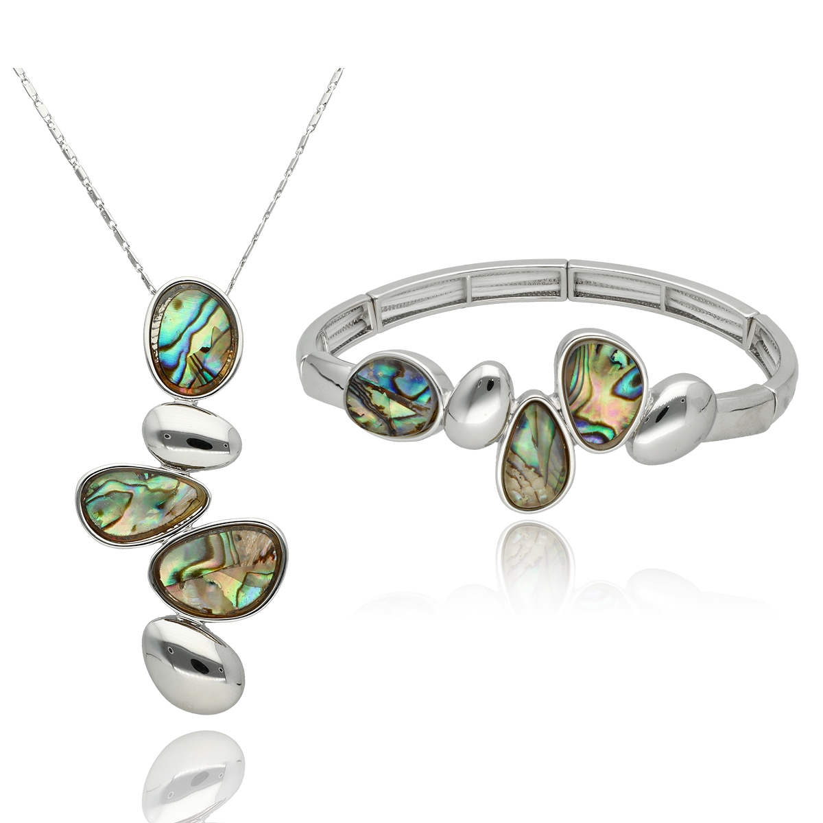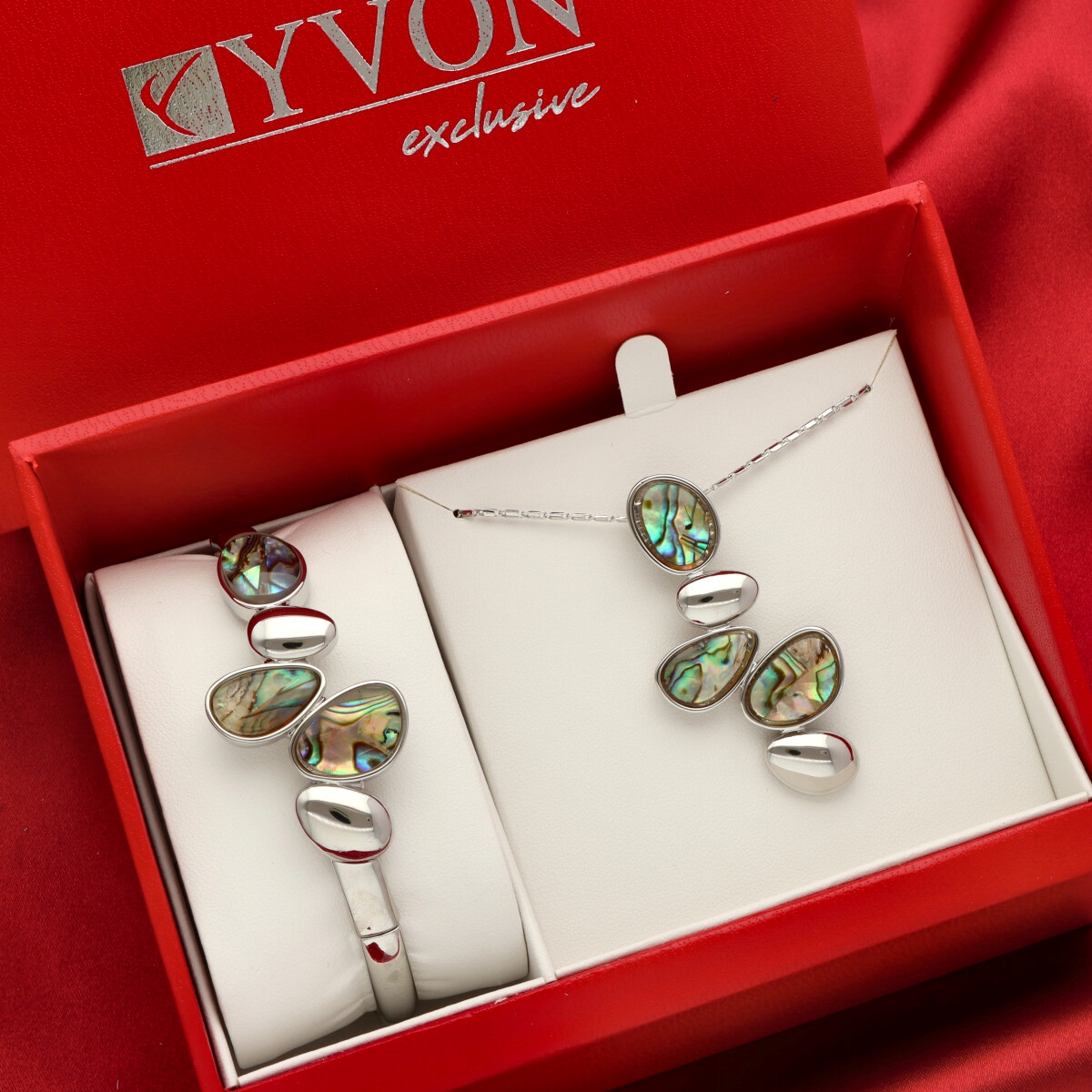 Ekskluzywny komplet biżuterii z linii YVON Exclusive, składający się z eleganckiego naszyjnika oraz dopasowanej bransolety. Zestaw wykonany jest z hipoalergicznego stopu cynku (zamak) oraz MUSZLI NATURALNEJ ABALONE. Starannie polerowane elementy nadają biżuterii nowoczesny, luksusowy charakter, jednocześnie zachowując lekkość i komfort noszenia.