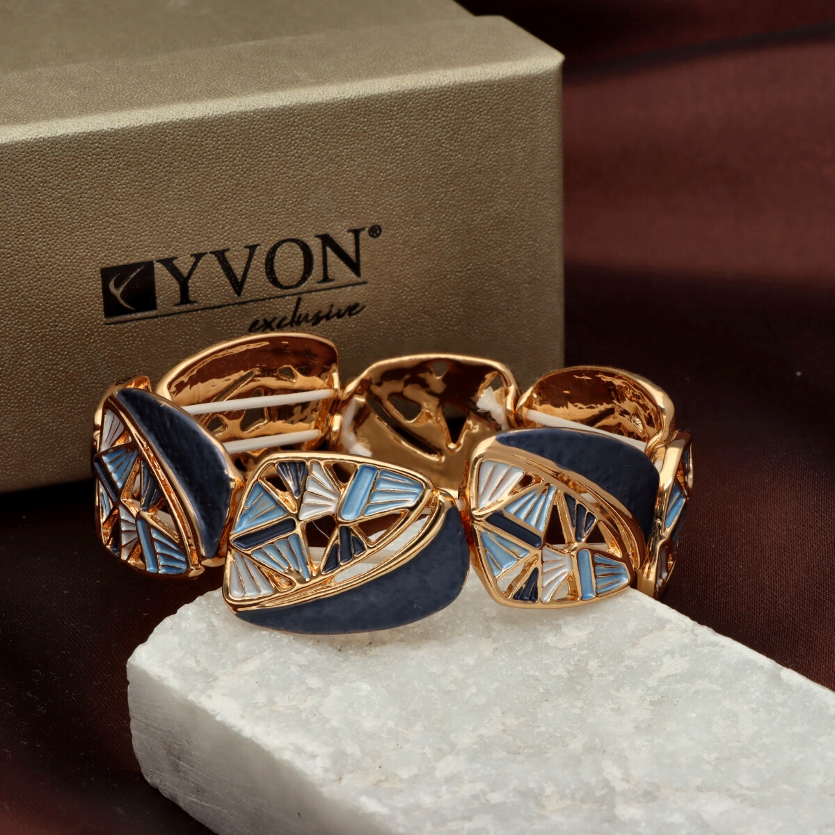 Bransoleta z kolekcji YVON BIŻUTERIA ARTYSTYCZNA, wykonana z metalu hipoalergicznego i zdobiona emaliowanymi elementami. Konstrukcja oparta na elastycznych gumeczkach dopasowuje się do każdego nadgarstka, zapewniając komfort noszenia. Wykończona z dbałością o detale, zachwyca artystycznym wzornictwem. Zapakowana w eleganckie pudełko prezentowe YVON – doskonały wybór zarówno do codziennych, jak i wieczorowych stylizacji.