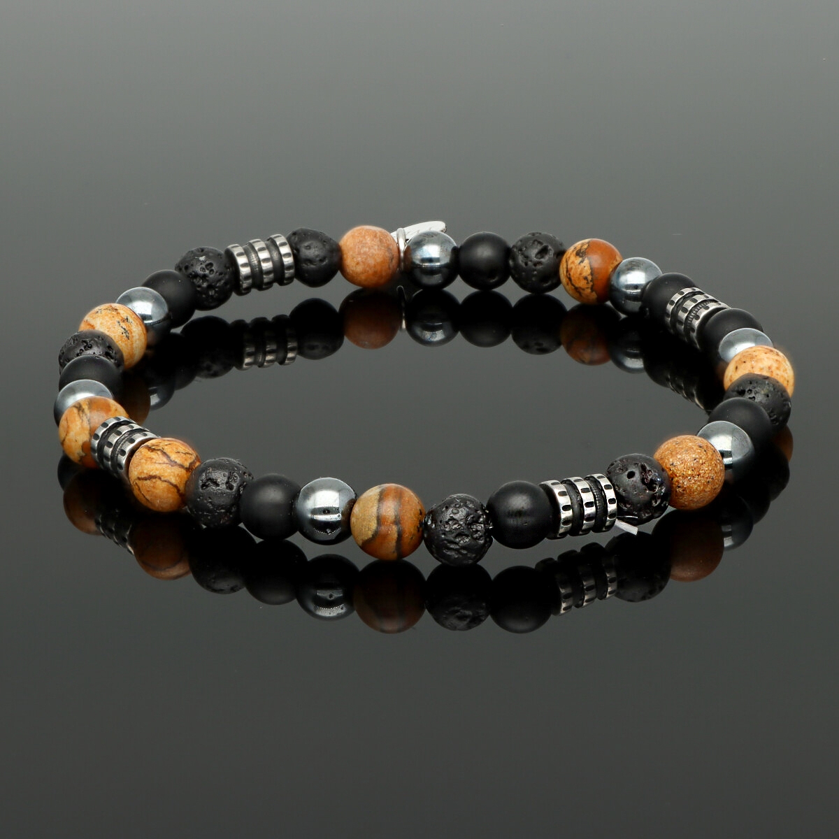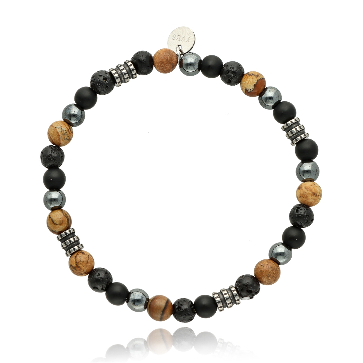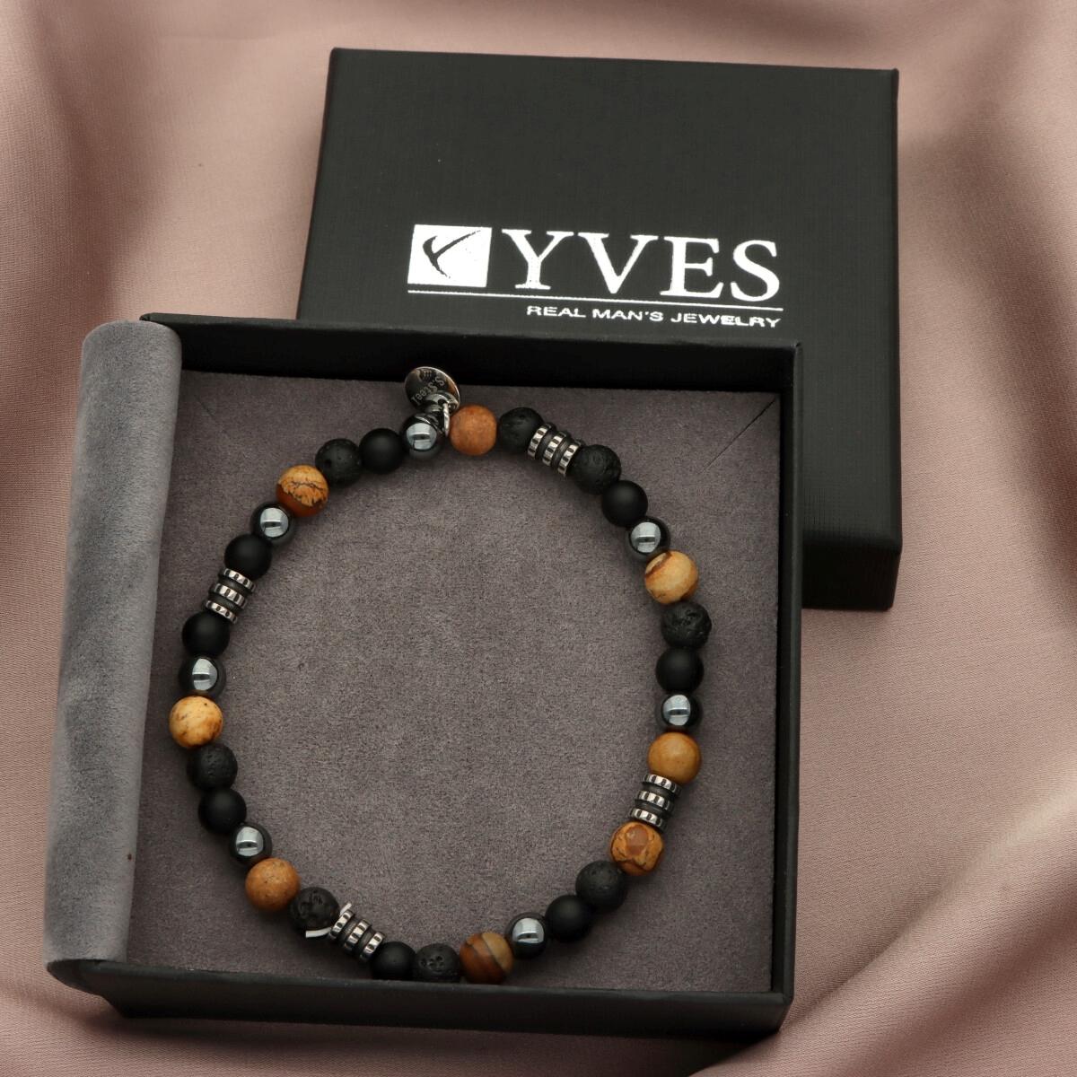 Bransoletka męska YVES wykonana z naturalnych kamieni (jaspis, lawa, agat, hematyt) zestawionych ze stalą szlachetną. Osadzona na wytrzymałych, elastycznych gumkach, dzięki czemu dopasowuje się do każdego nadgarstka. W pełni antyalergiczna, komfortowa w noszeniu. Bransoletka pakowana w eleganckie pudełko, idealna zarówno na co dzień, jak i w formie prezentu. Stanowi komplet z naszyjnikiem o tym samym indeksie.