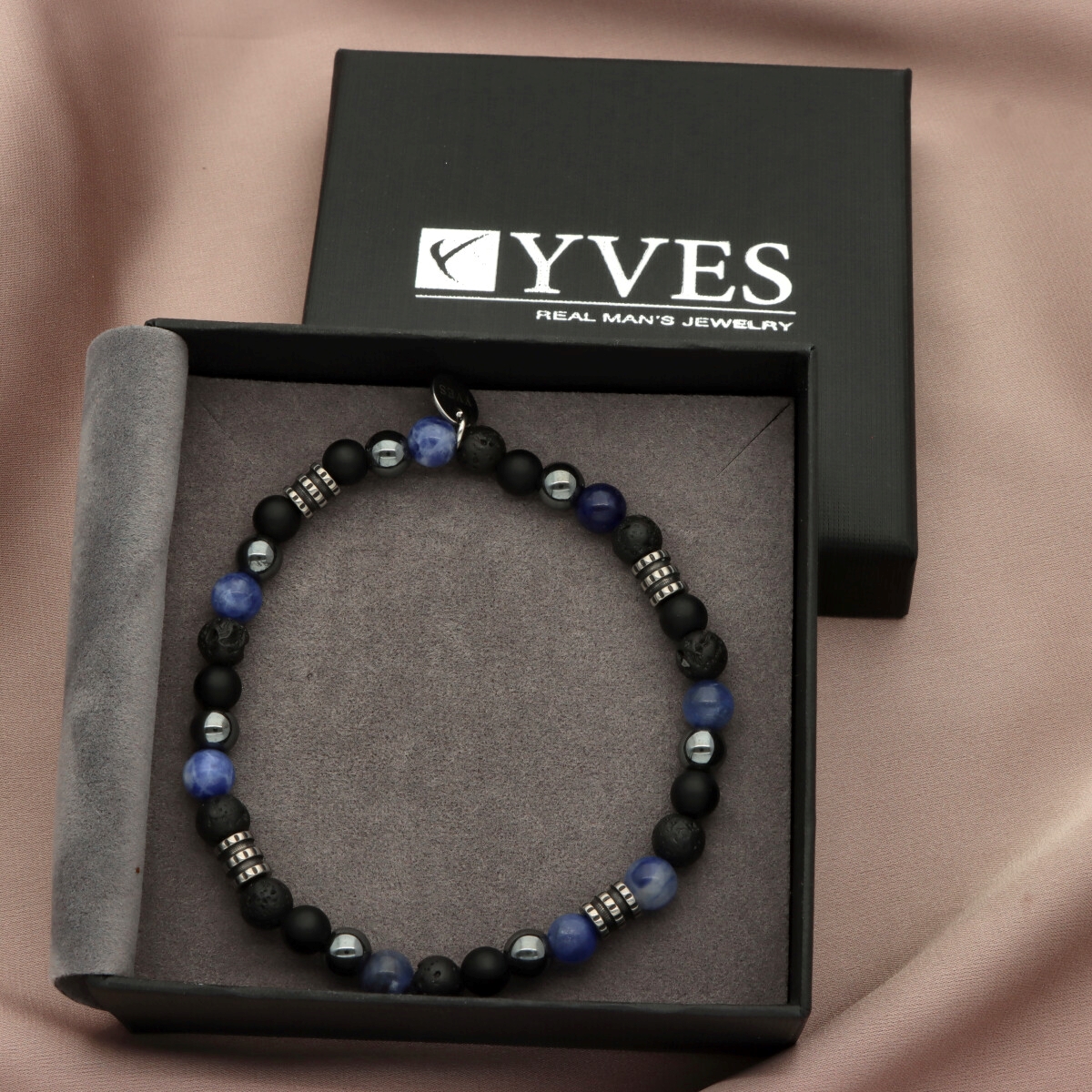 Bransoletka męska YVES wykonana z naturalnych kamieni (lapis Lazuri, lawa, agat, hematyt) zestawionych ze stalą szlachetną. Osadzona na wytrzymałych, elastycznych gumkach, dzięki czemu dopasowuje się do każdego nadgarstka. W pełni antyalergiczna, komfortowa w noszeniu. Bransoletka pakowana w eleganckie pudełko, idealna zarówno na co dzień, jak i w formie prezentu. Stanowi komplet z naszyjnikiem o tym samym indeksie.