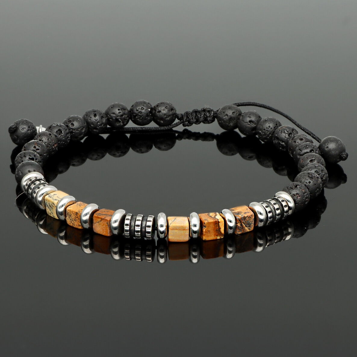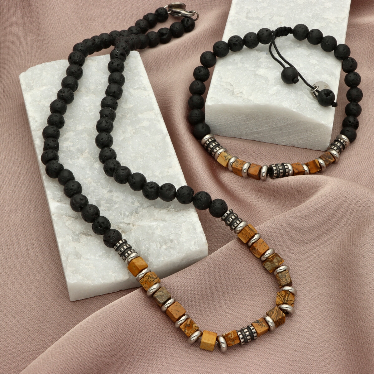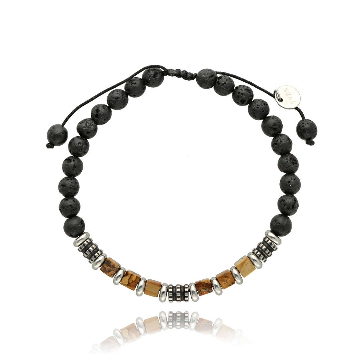 Bransoletka męska YVES wykonana z naturalnych kamieni – jaspisu obrazkoweo i kamienia lawa – zestawionych ze stalą szlachetną. Na zacisk, dzięki czemu dopasowuje się do każdego nadgarstka. W pełni antyalergiczna, komfortowa w noszeniu. Bransoletka pakowana w eleganckie pudełko, idealna zarówno na co dzień, jak i w formie prezentu. Stanowi komplet z naszyjnikiem o tym samym indeksie.