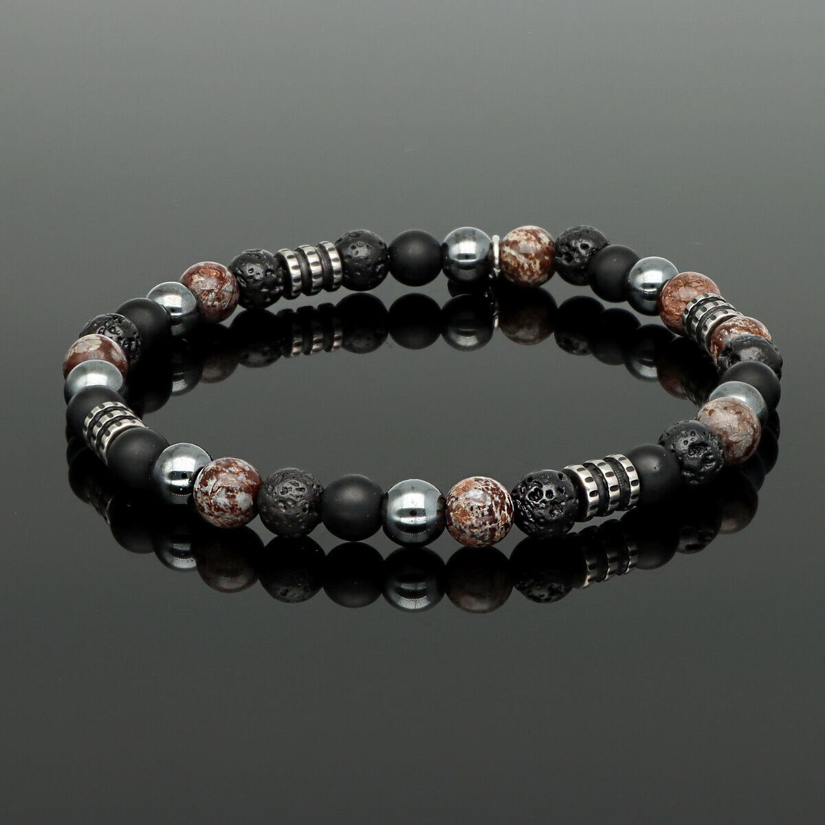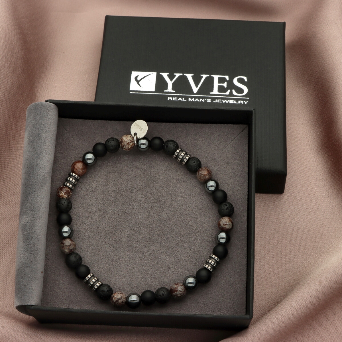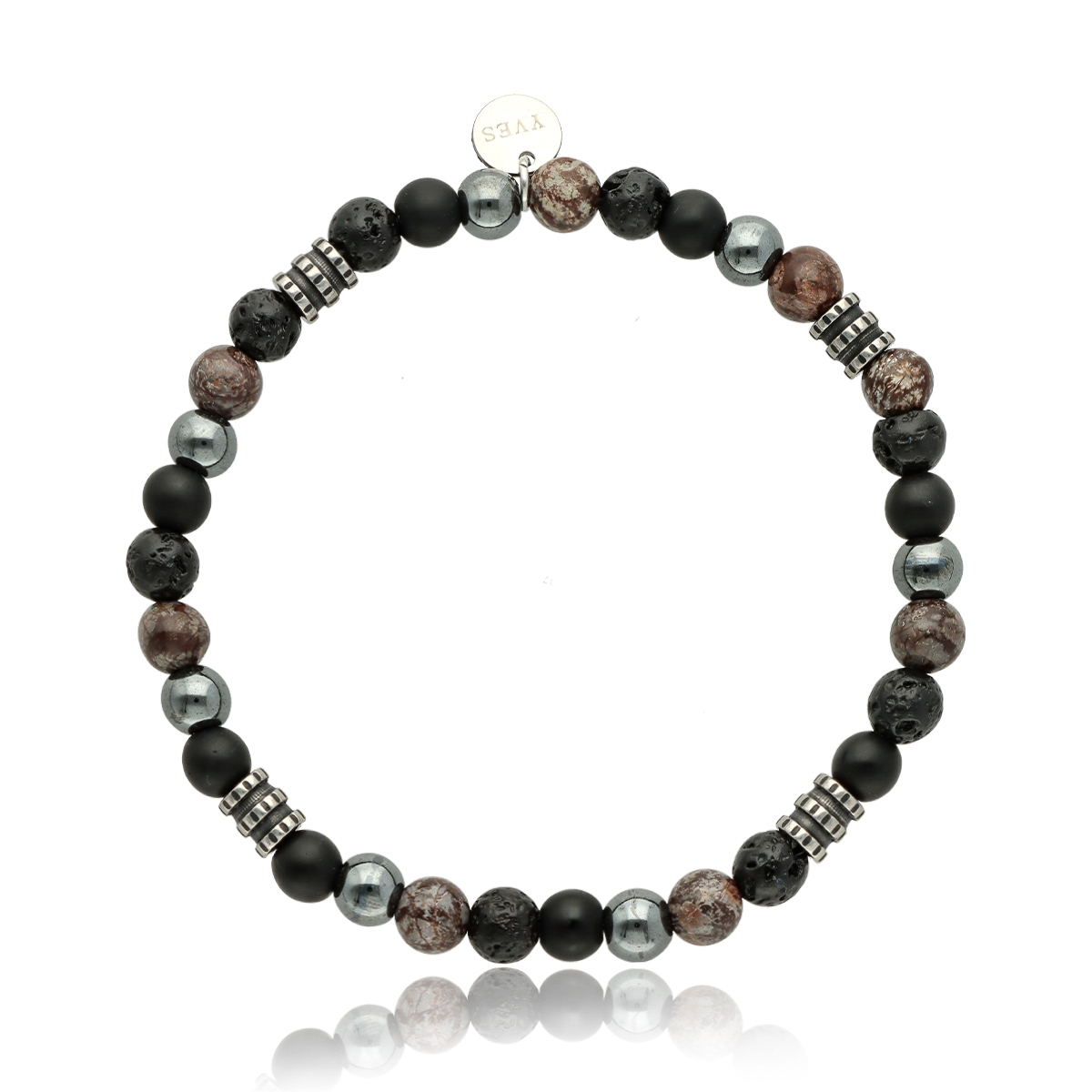 Bransoletka męska YVES wykonana z naturalnych kamieni (obsydian snowflake, lawa, agat, hematyt) zestawionych ze stalą szlachetną. Osadzona na wytrzymałych, elastycznych gumkach, dzięki czemu dopasowuje się do każdego nadgarstka. W pełni antyalergiczna, komfortowa w noszeniu. Bransoletka pakowana w eleganckie pudełko, idealna zarówno na co dzień, jak i w formie prezentu. Stanowi komplet z naszyjnikiem o tym samym indeksie.