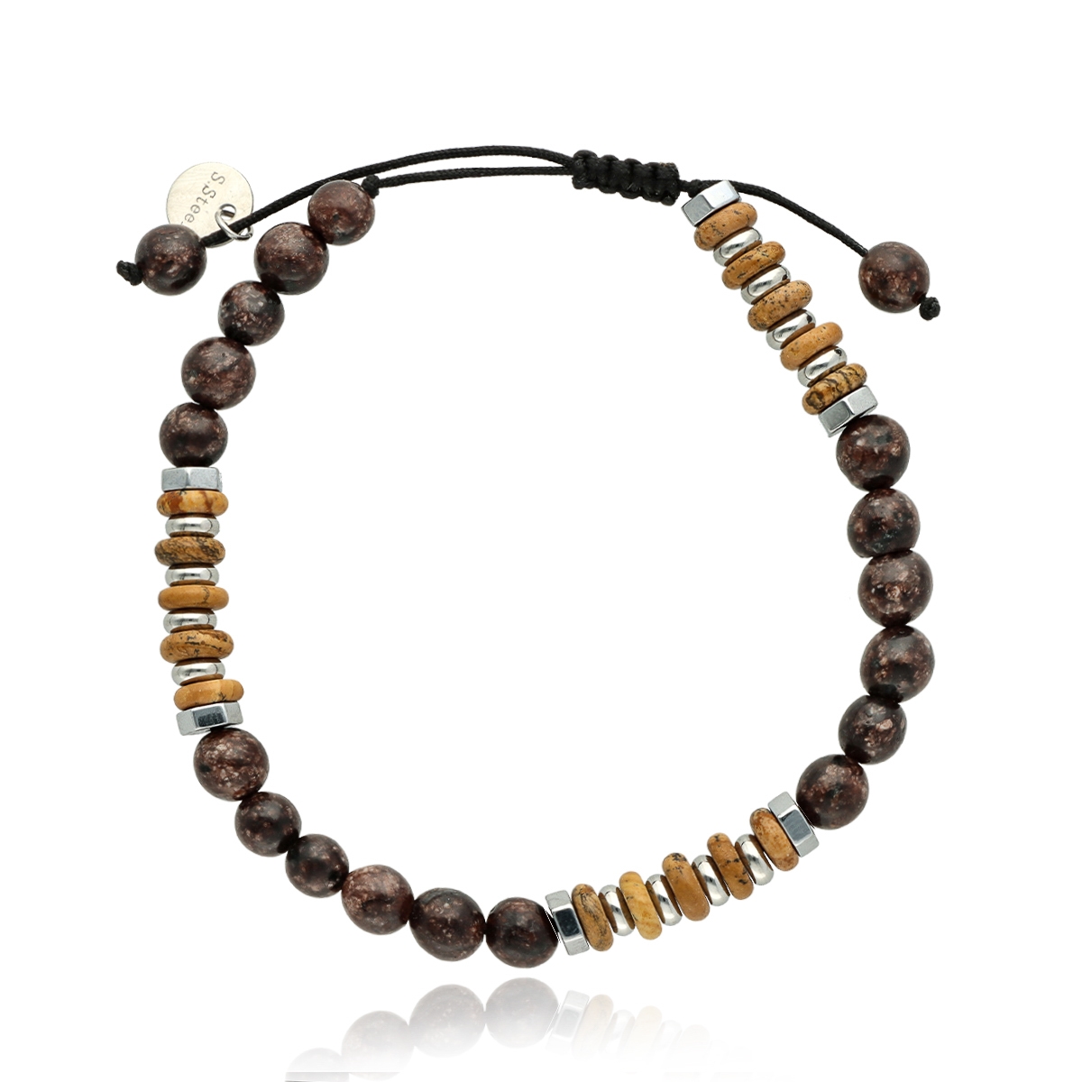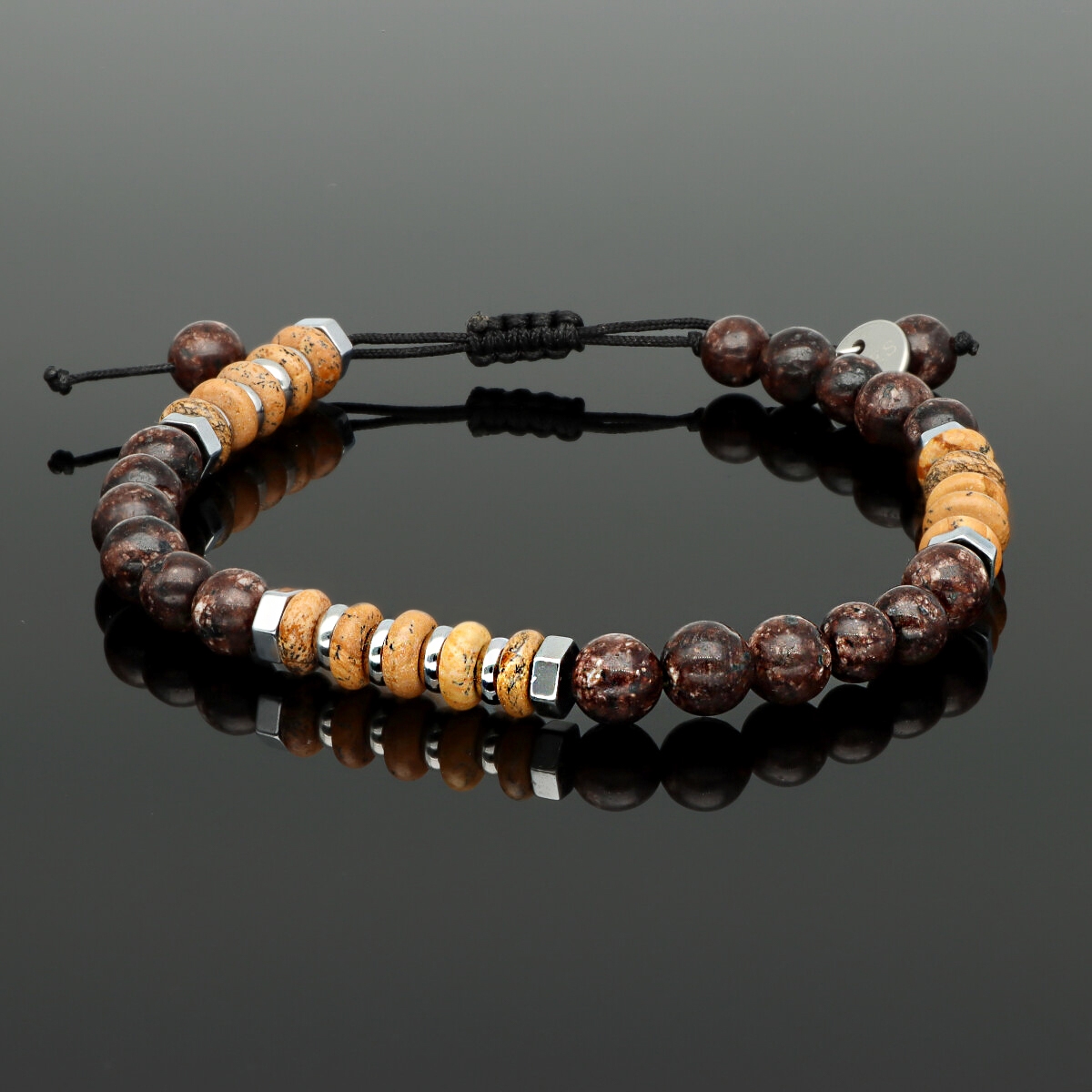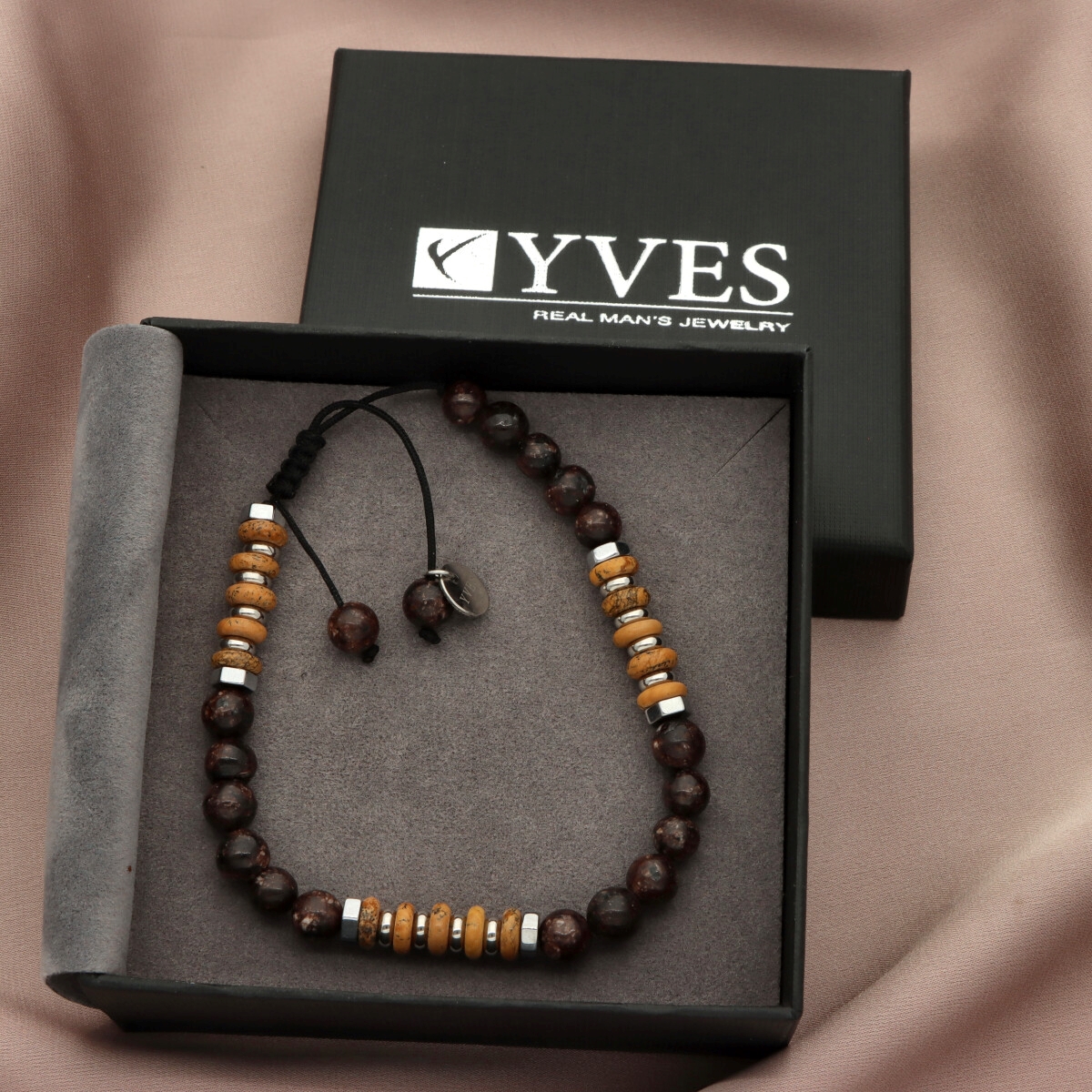 Bransoletka męska YVES wykonana z naturalnych kamieni (obsydian snowflake, jaspis obrazkowy) zestawionych ze stalą szlachetną. Na zacisk, dzięki czemu dopasowuje się do każdego nadgarstka. W pełni antyalergiczna, komfortowa w noszeniu. Bransoletka pakowana w eleganckie pudełko, idealna zarówno na co dzień, jak i w formie prezentu. Stanowi komplet z naszyjnikiem o tym samym indeksie.