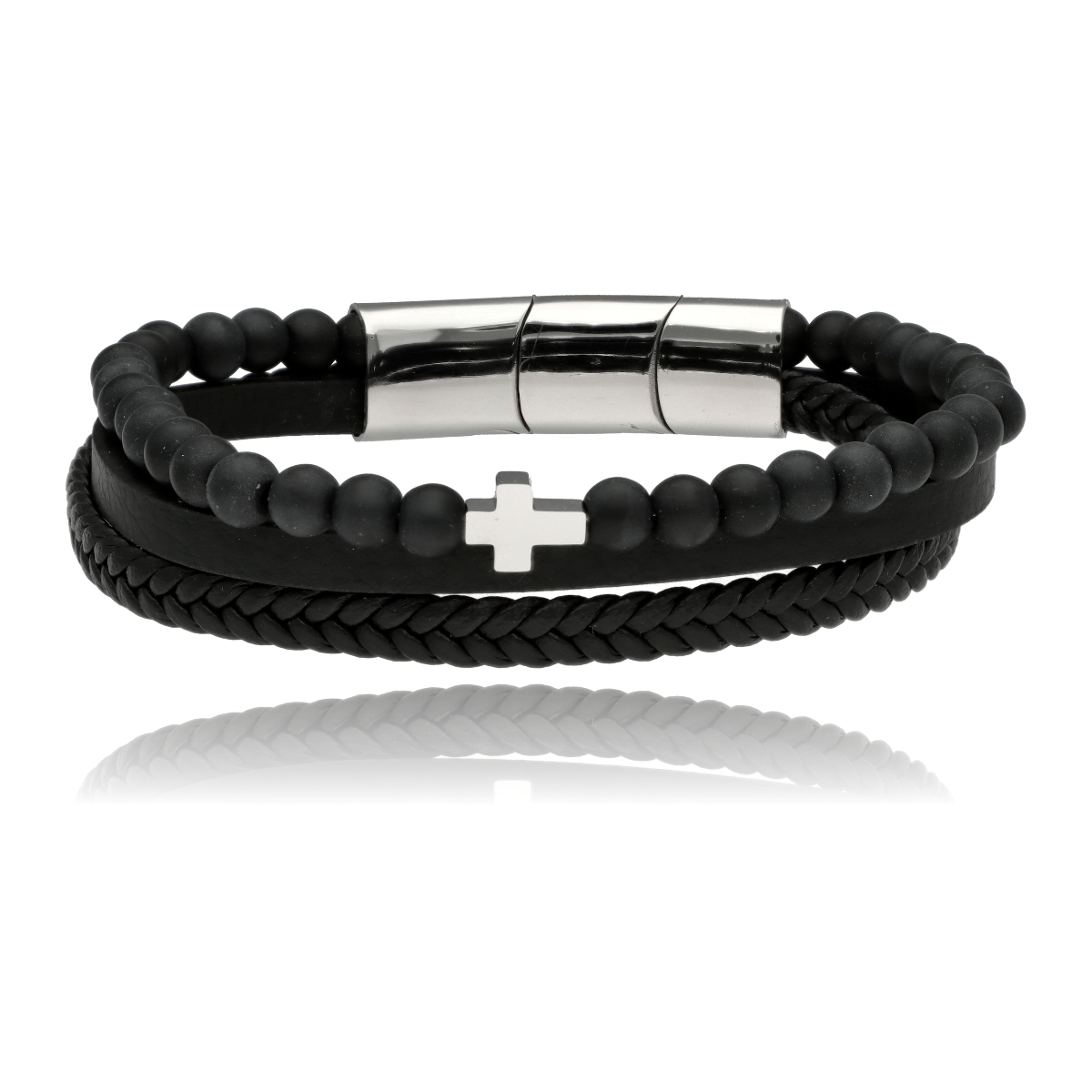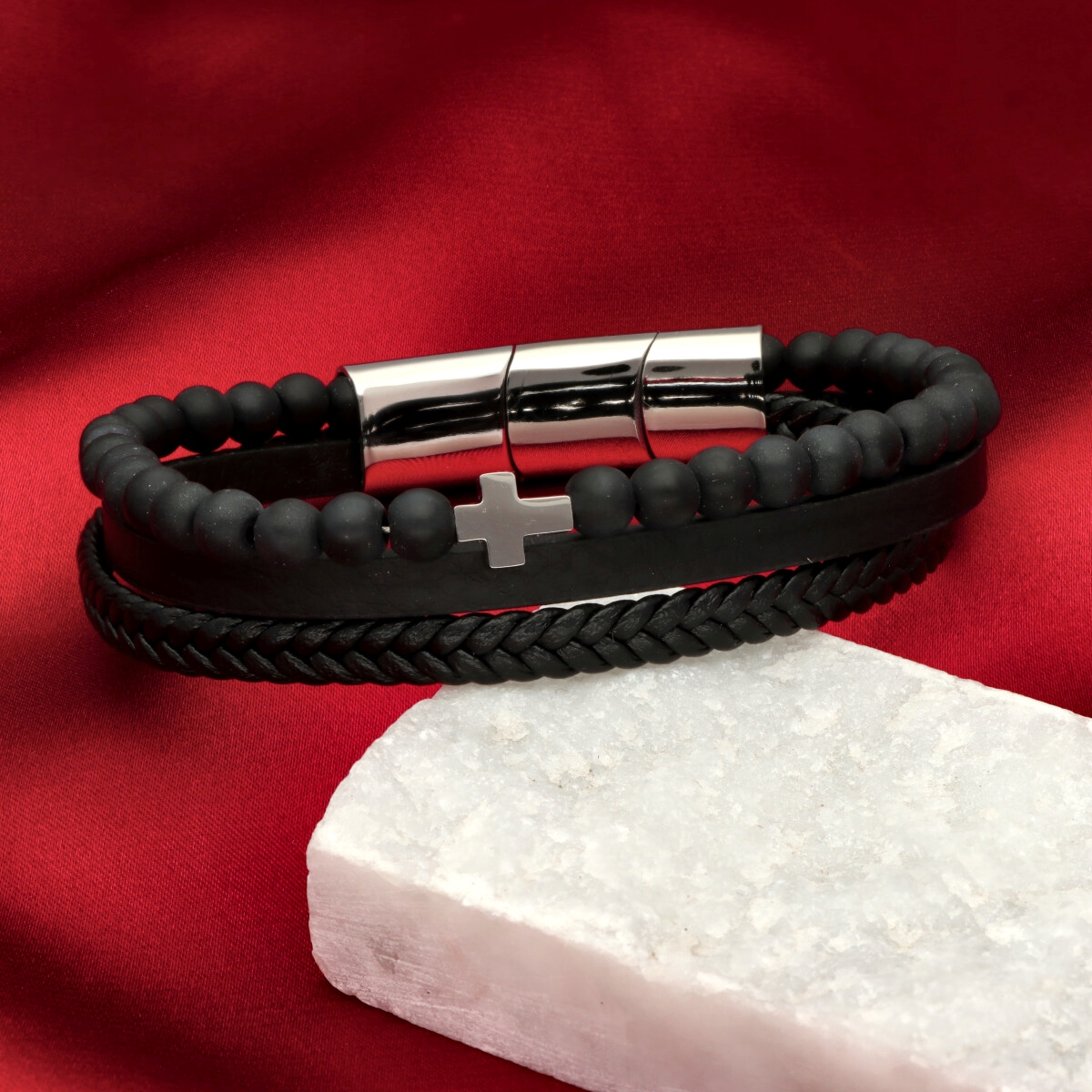 Męska bransoleta wykonana z naturalnej skóry, kamieni LAWA oraz stali szlachetnej 316L, odpornej na uszkodzenia i hipoalergicznej. Prosty, nowoczesny design sprawia, że pasuje zarówno na co dzień, jak i do bardziej eleganckich stylizacji. Model posiada trójdzielny magnes, który ułatwia zakładanie i jednocześnie pozwala regulować długość. Po usunięciu jednego z segmentów można dopasować bransoletę do indywidualnego obwodu nadgarstka. Maksymalna długość: 23 cm. W eleganckim pudełku GRATIS.