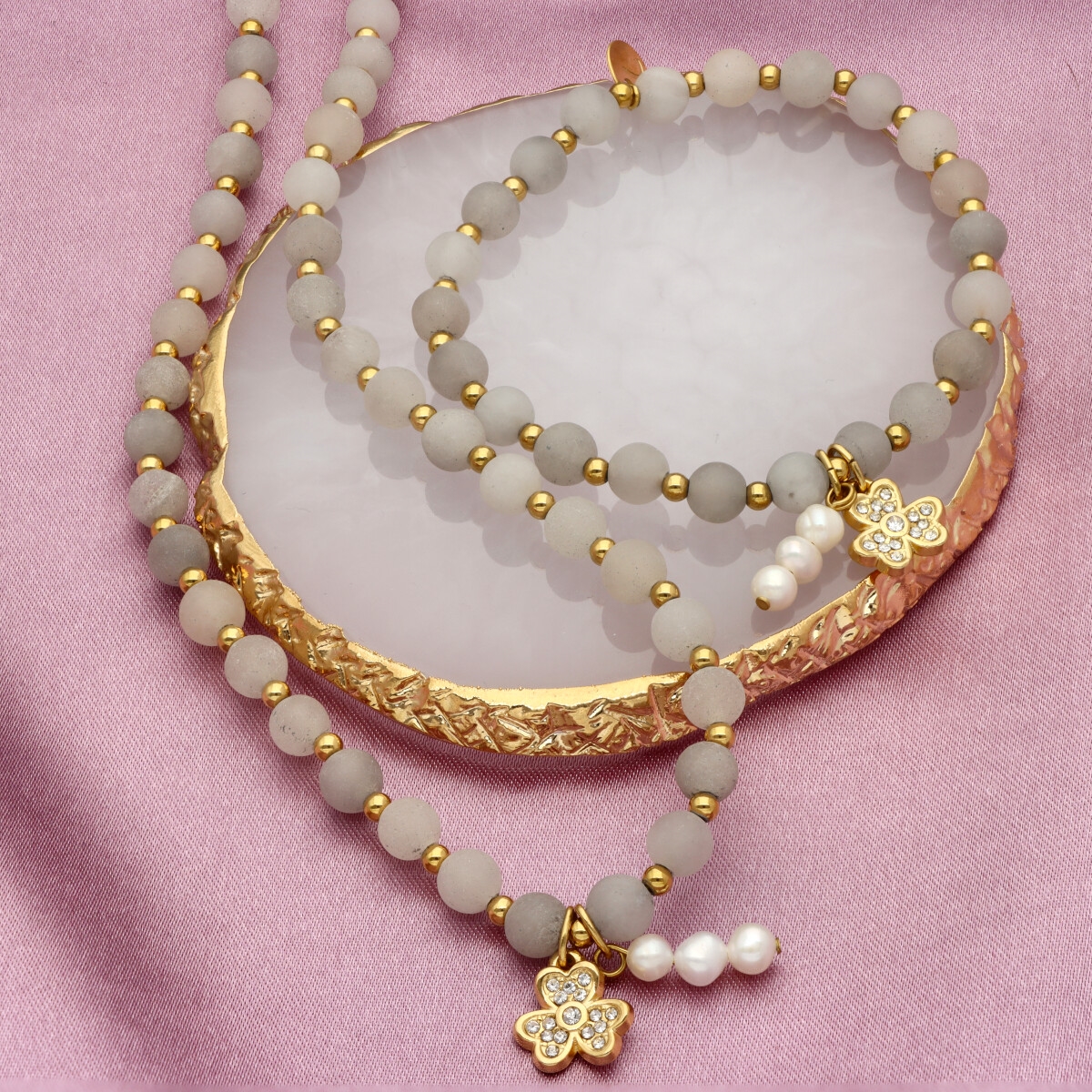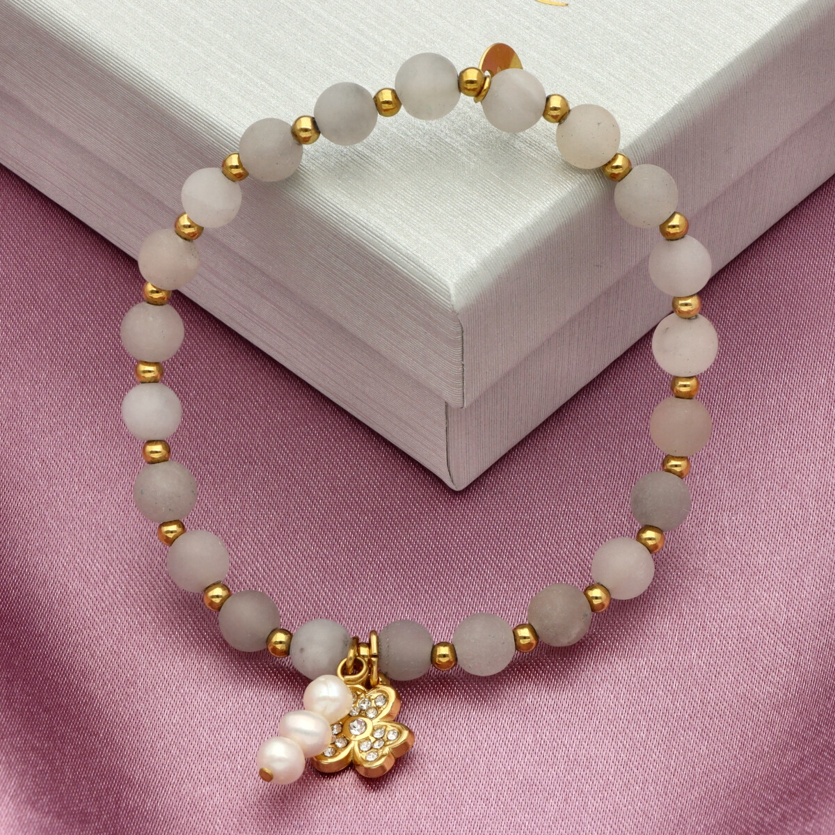 Delikatna bransoletka wykonana z agatu i pereł naturalnych, uzupełniona pozłacaną stalą szlachetną. Kamienie dodają całości głębi, a eleganckie złocenie subtelnie podkreśla kobiecy styl. Biżuteria pakowana jest w eleganckie pudełko prezentowe, które podkreśla jej wyjątkowy charakter – idealna propozycja na prezent bez dodatkowych kosztów. Do kompletu polecamy również naszyjnik o tym samym indeksie numerycznym, tworząc harmonijny i dopracowany zestaw biżuterii.