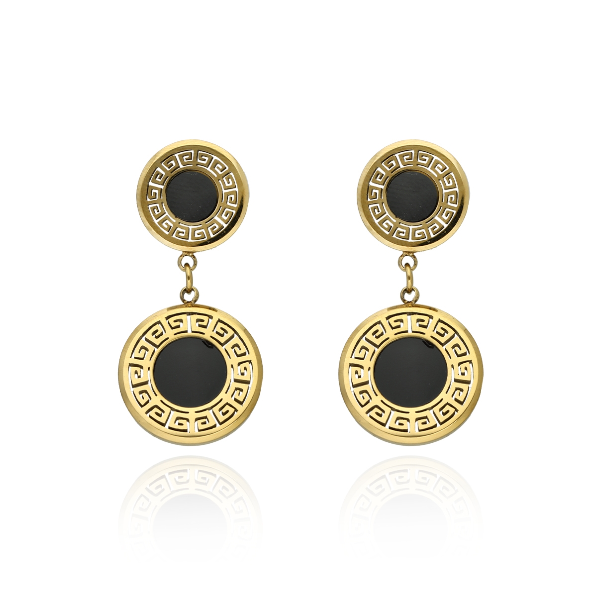 Kolczyki wykonane z hipoalergicznej stali 316L, pozłacanej 16-karatowym złotem. Model podwójny, składający się z dwóch połączonych elementów o średnicach 14 mm i 18 mm, co daje całkowitą długość ok. 3,5 cm.