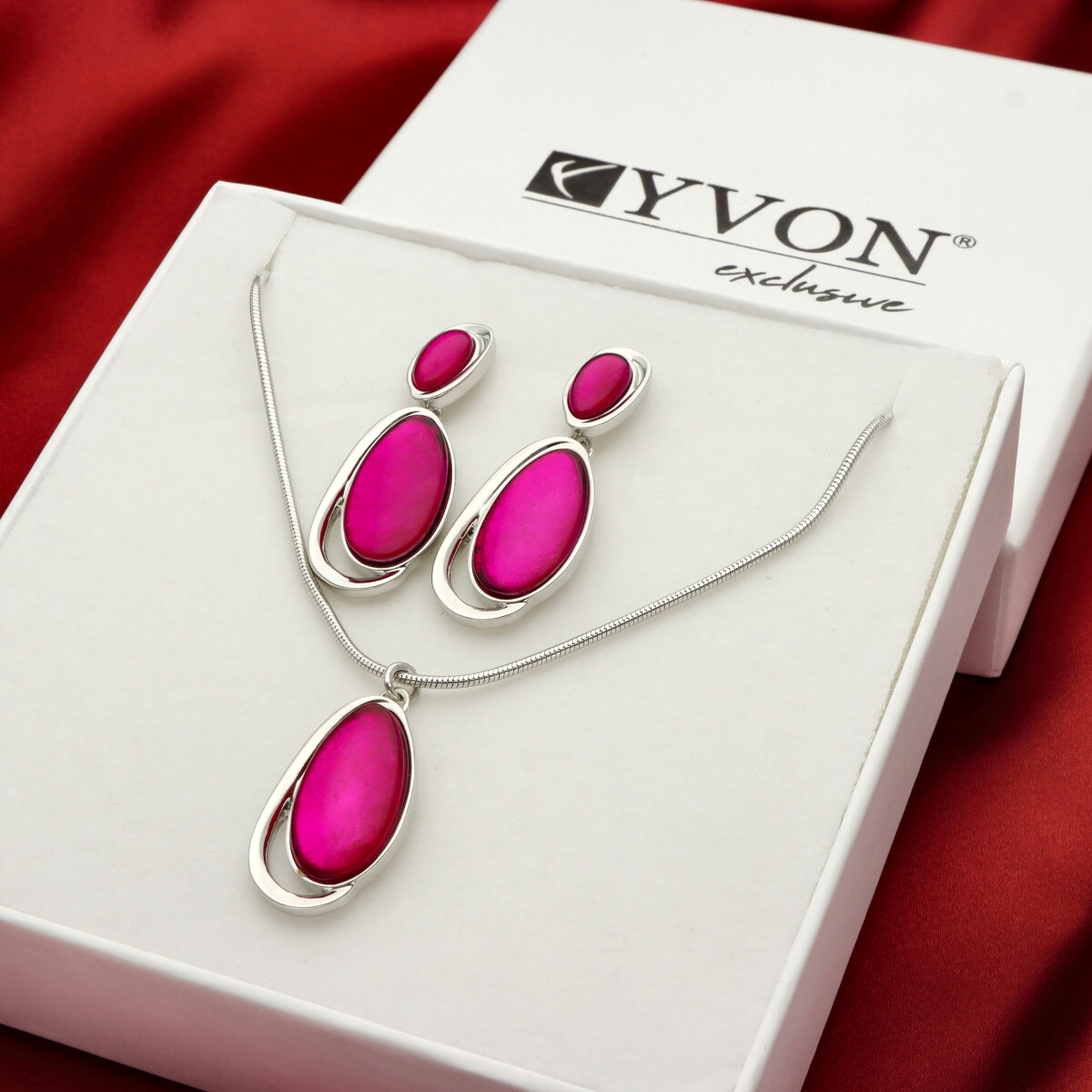 Komplet biżuterii składający się z naszyjnika oraz kolczyków, zapakowany w pudełko prezentowe. Wykonany z hipoalergicznego metalu oraz żywicy jubilerskiej. Lekka forma zapewnia komfort codziennego użytkowania. Długość naszyjnika wynosi 42 cm, dodatkowo 8 cm zawieszki. Długość kolczyków to około 3 cm. Specyfikacja: zestaw: naszyjnik + kolczyki materiał: hipoalergiczny metal, żywica jubilerska długość naszyjnika: 42 cm + 8 cm zawieszka długość kolczyków: ok. 3 cm pudełko prezentowe w zestawie
