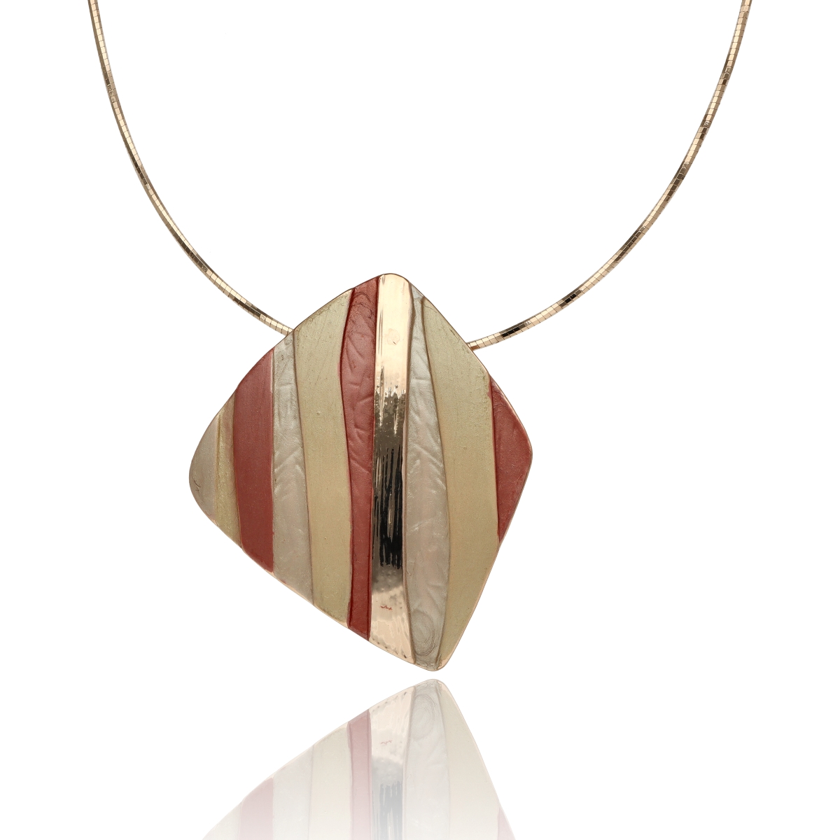 Opis produktu: Naszyjnik o długości 42 cm + 8 cm przedłużki, z ozdobnym elementem o szerokości ok. 5 cm. Wyrazista, geometryczna forma z nieregularnymi pasami tworzy nowoczesną, artystyczną kompozycję, która przyciąga uwagę i nadaje biżuterii unikalnego charakteru. Naszyjnik wykonany z hipoalergicznego metalu (zamak – stop cynku, bezpieczny dla wrażliwej skóry), ozdobiony kolorową emalią o delikatnej strukturze i efekcie głębi. Do kompletu szukaj pasującej bransoletki, kolczyków oraz pierścionka o tym samym indeksie numerycznym.