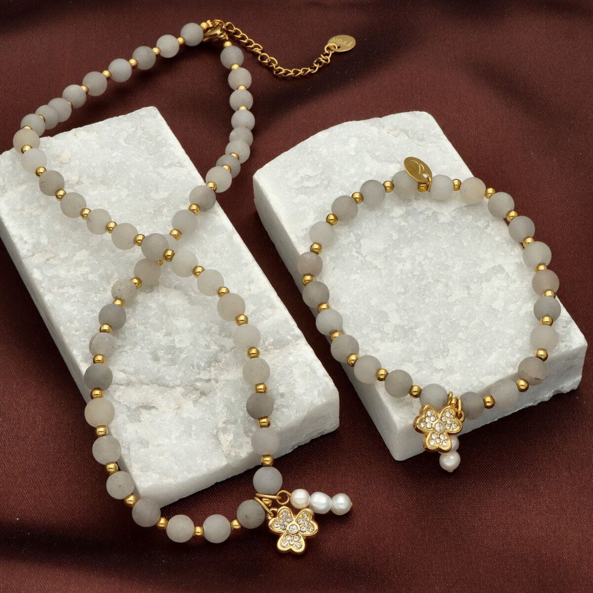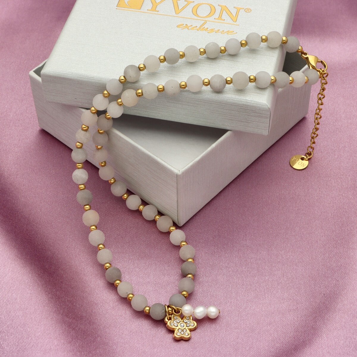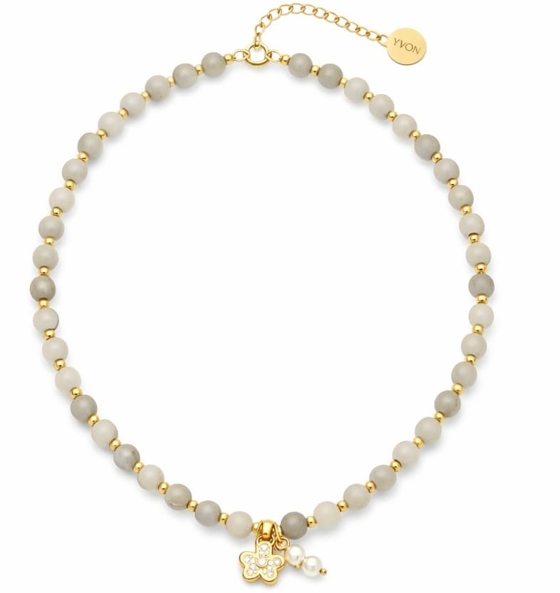 Zjawiskowy naszyjnik wykonany z pozłacanej stali szlachetnej, agatu i pereł naturalnych. Połączenie elegancji z subtelną energią kamieni sprawia, że naszyjnik idealnie dopełnia zarówno codzienne, jak i wieczorowe stylizacje. Długość 40 cm + 5 cm regulacji umożliwia dopasowanie do różnych dekoltów.