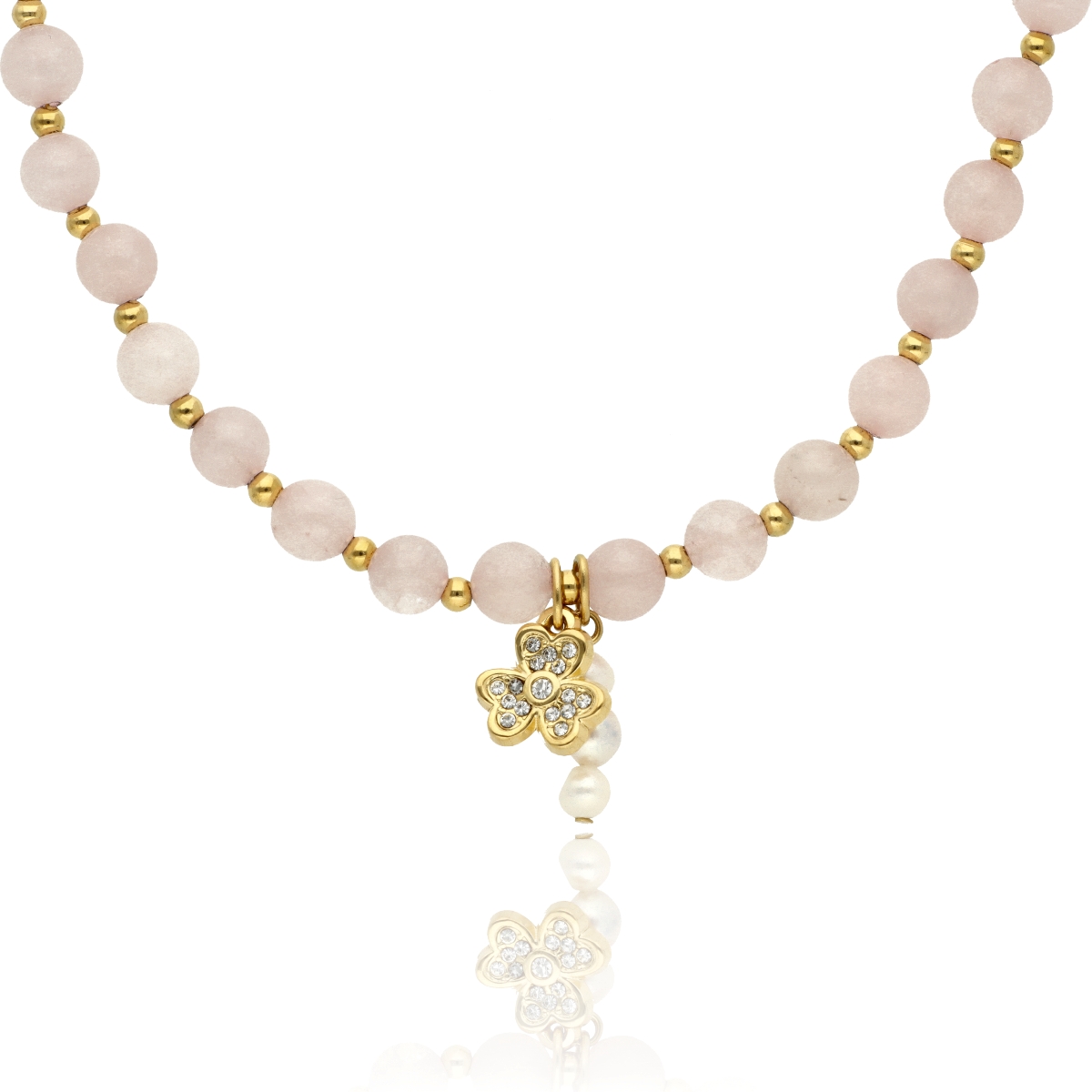 Zjawiskowy naszyjnik wykonany z pozłacanej stali szlachetnej, kwarcu różowego i pereł naturalnych. Połączenie elegancji z subtelną energią kamieni sprawia, że naszyjnik idealnie dopełnia zarówno codzienne, jak i wieczorowe stylizacje. Długość 40 cm + 5 cm regulacji umożliwia dopasowanie do różnych dekoltów.