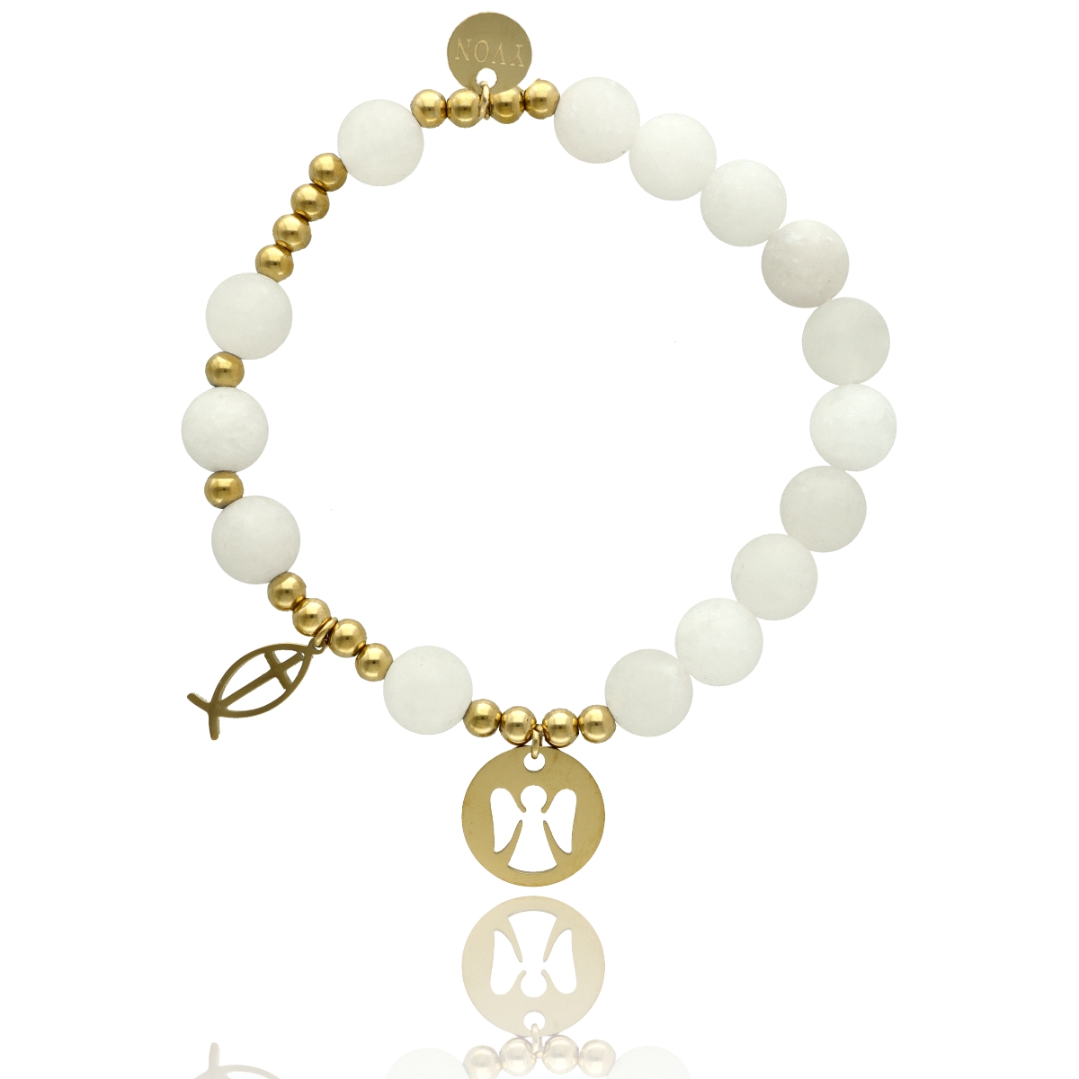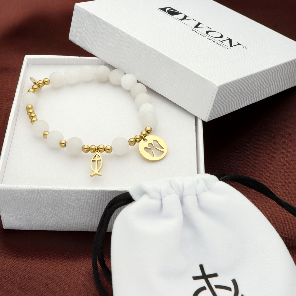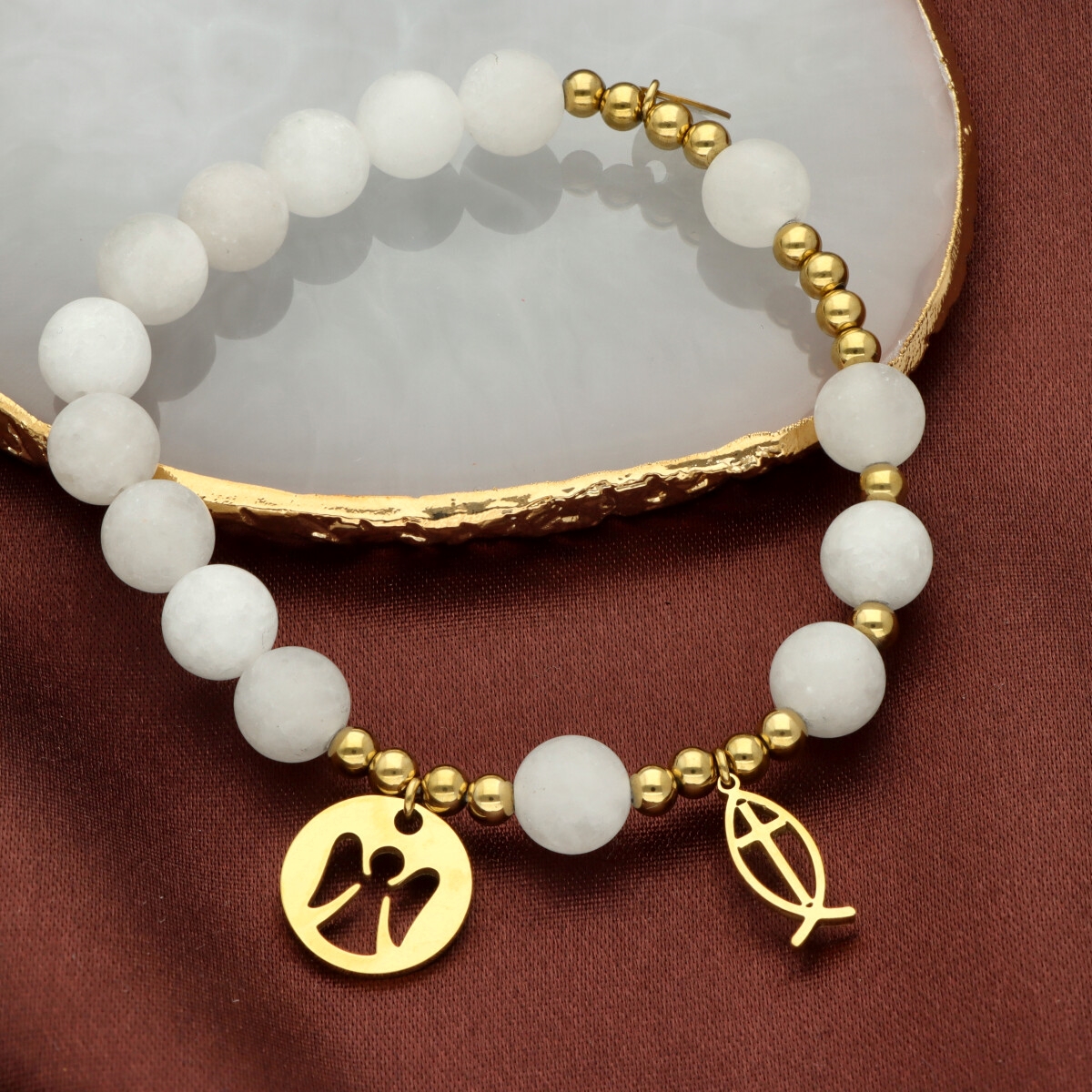 Różaniec na rękę damski, wykonany ze stali szlachetnej złoconej i kamieni naturalnych (agat mleczny matowy).