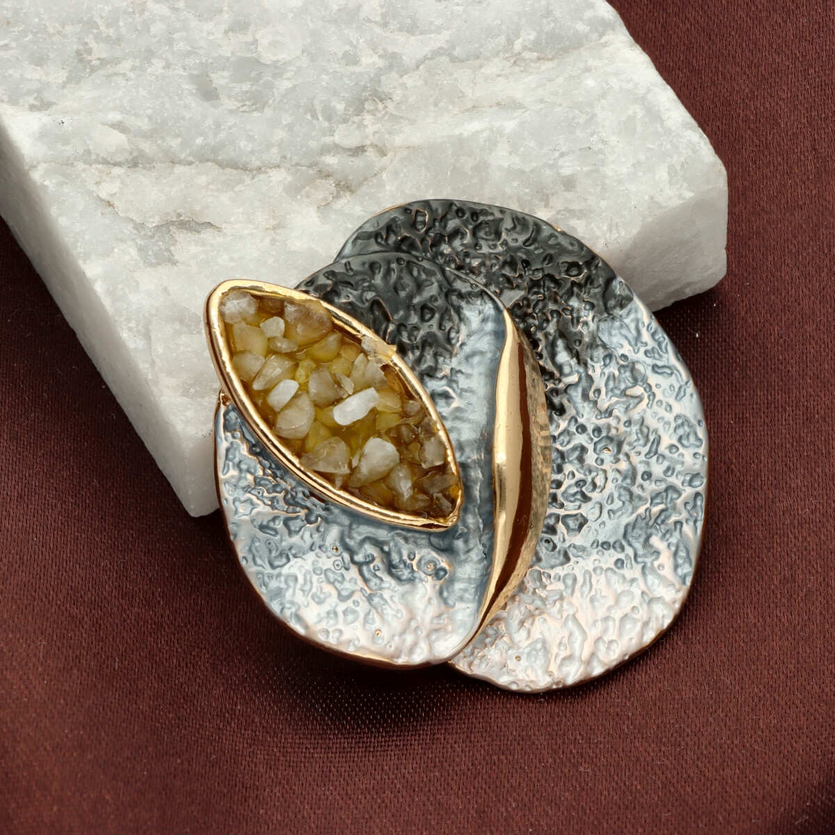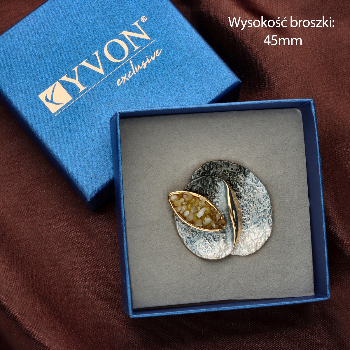 Broszka na magnes z kolekcji YVON biżuteria artystyczna, wykonana z metalu hipoalergicznego i zdobiona ręcznie nanoszoną emalią. Średnica broszki ok. 5 cm. Mocny magnes umożliwia przypięcie bez ryzyka uszkodzenia tkaniny – idealna do płaszczy, szali i torebek. Każdy egzemplarz pakowany jest w eleganckie pudełko prezentowe YVON.