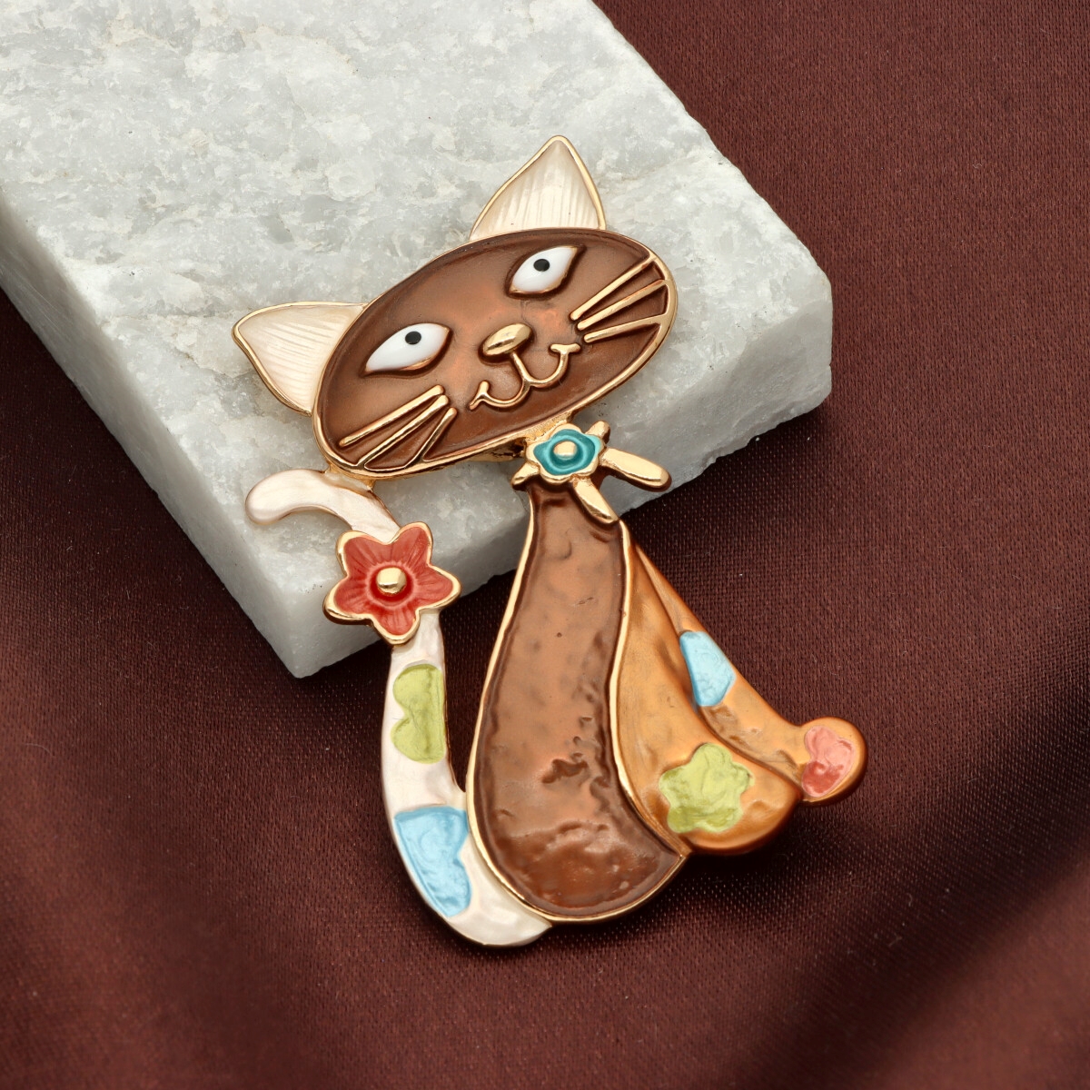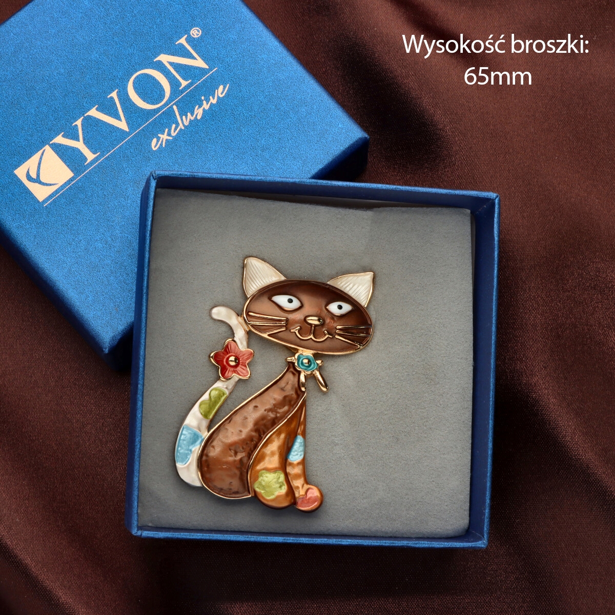 Broszka na magnes z kolekcji YVON biżuteria artystyczna, wykonana z metalu hipoalergicznego i zdobiona ręcznie nanoszoną emalią. Średnica broszki ok. 5 cm. Mocny magnes umożliwia przypięcie bez ryzyka uszkodzenia tkaniny – idealna do płaszczy, szali i torebek. Każdy egzemplarz pakowany jest w eleganckie pudełko prezentowe YVON.