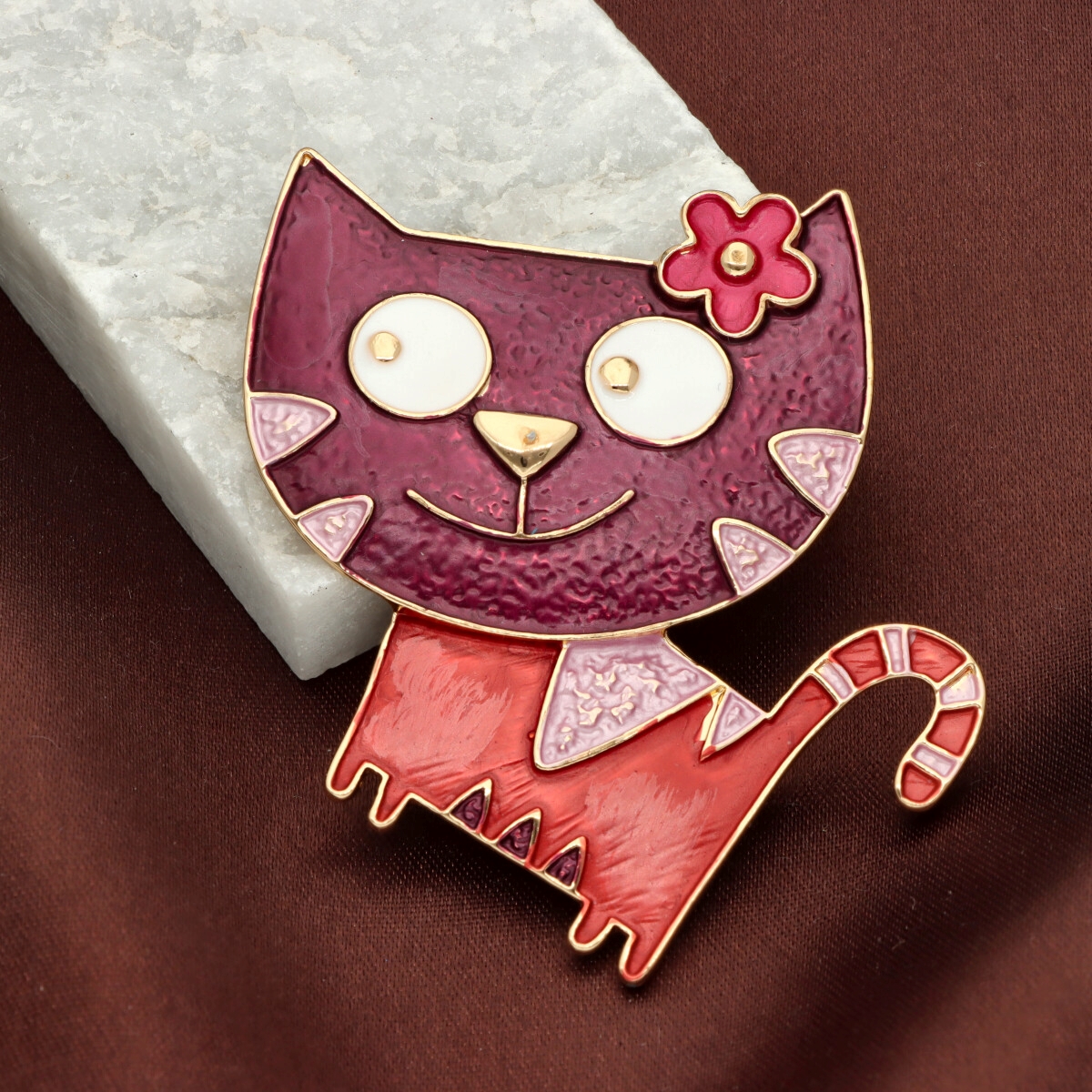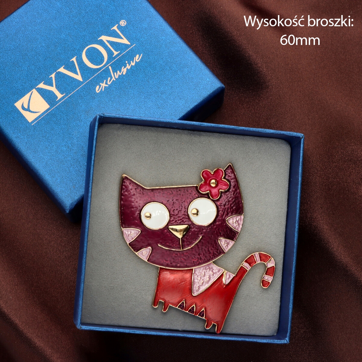 Broszka na magnes z kolekcji YVON biżuteria artystyczna, wykonana z metalu hipoalergicznego i zdobiona ręcznie nanoszoną emalią. Średnica broszki ok. 5 cm. Mocny magnes umożliwia przypięcie bez ryzyka uszkodzenia tkaniny – idealna do płaszczy, szali i torebek. Każdy egzemplarz pakowany jest w eleganckie pudełko prezentowe YVON.