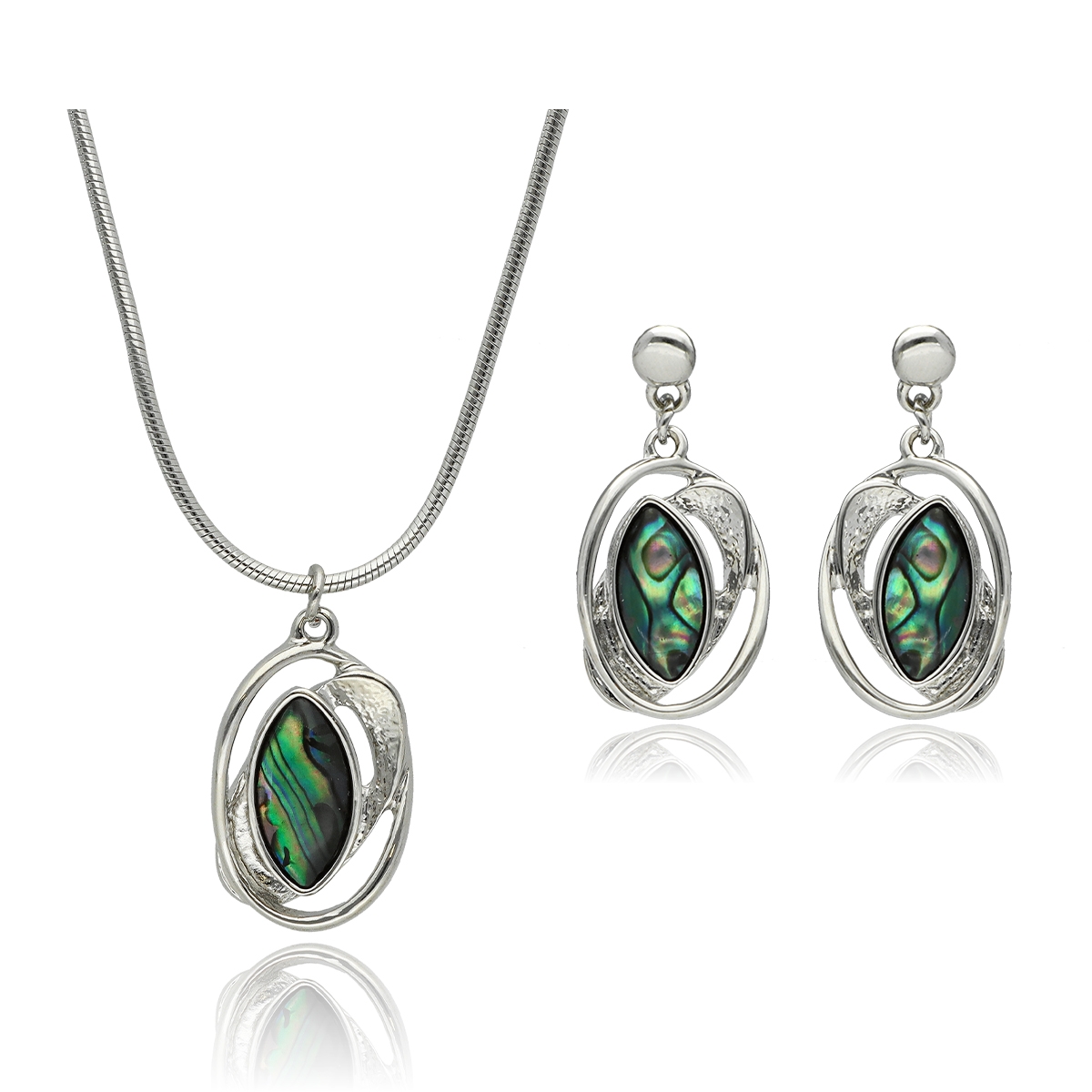 Komplet biżuterii składający się z naszyjnika oraz kolczyków, zapakowany w pudełko prezentowe. Wykonany z hipoalergicznego metalu oraz muszli ABALON. Lekka forma zapewnia komfort codziennego użytkowania. Długość naszyjnika wynosi 42 cm, dodatkowo 8 cm zawieszki. Długość kolczyków to około 3 cm. Specyfikacja: zestaw: naszyjnik + kolczyki materiał: hipoalergiczny metal, muszla abalon długość naszyjnika: 42 cm + 8 cm zawieszka długość kolczyków: ok. 3 cm pudełko prezentowe w zestawie