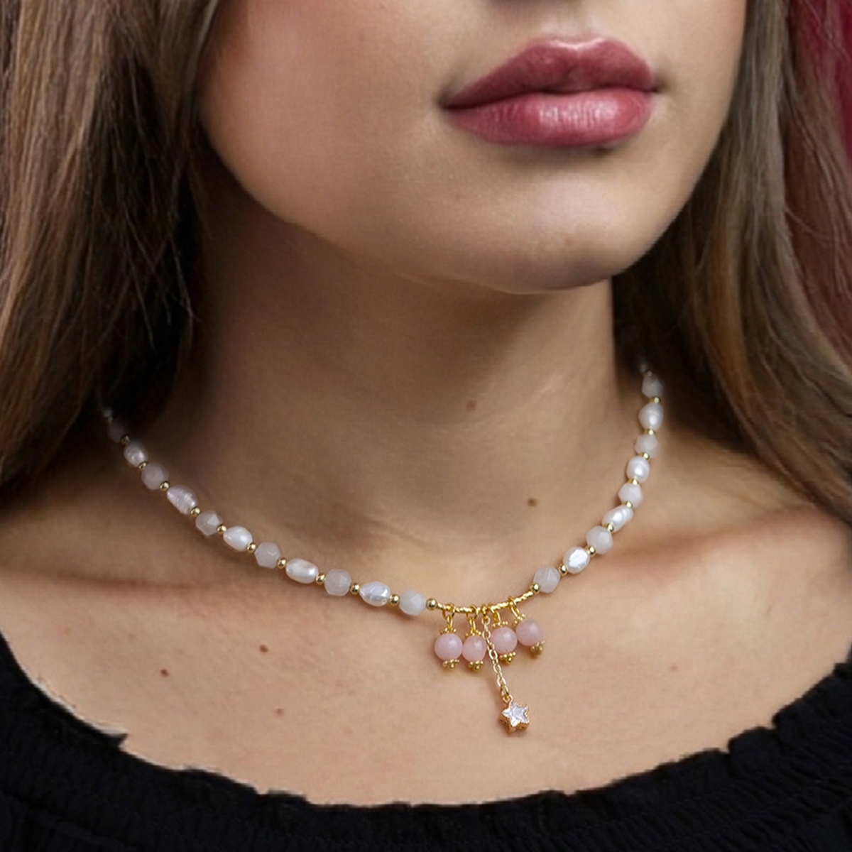 Ekskluzywny naszyjnik z kolekcji LOVELY STONES wykonany z najwyższej jakości mosiądzu oraz pereł naturalnych, kwarcu, cyrkonii. Długość: 42 cm + regulacja.