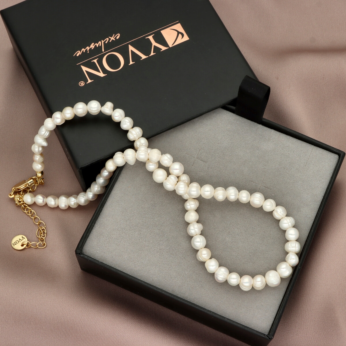 Naszyjnik wykonany z NATURALNYCH PEREŁ SŁODKOWODNYCH o subtelnym, naturalnym połysku. Każda perła różni się kształtem, co podkreśla autentyczny charakter biżuterii.