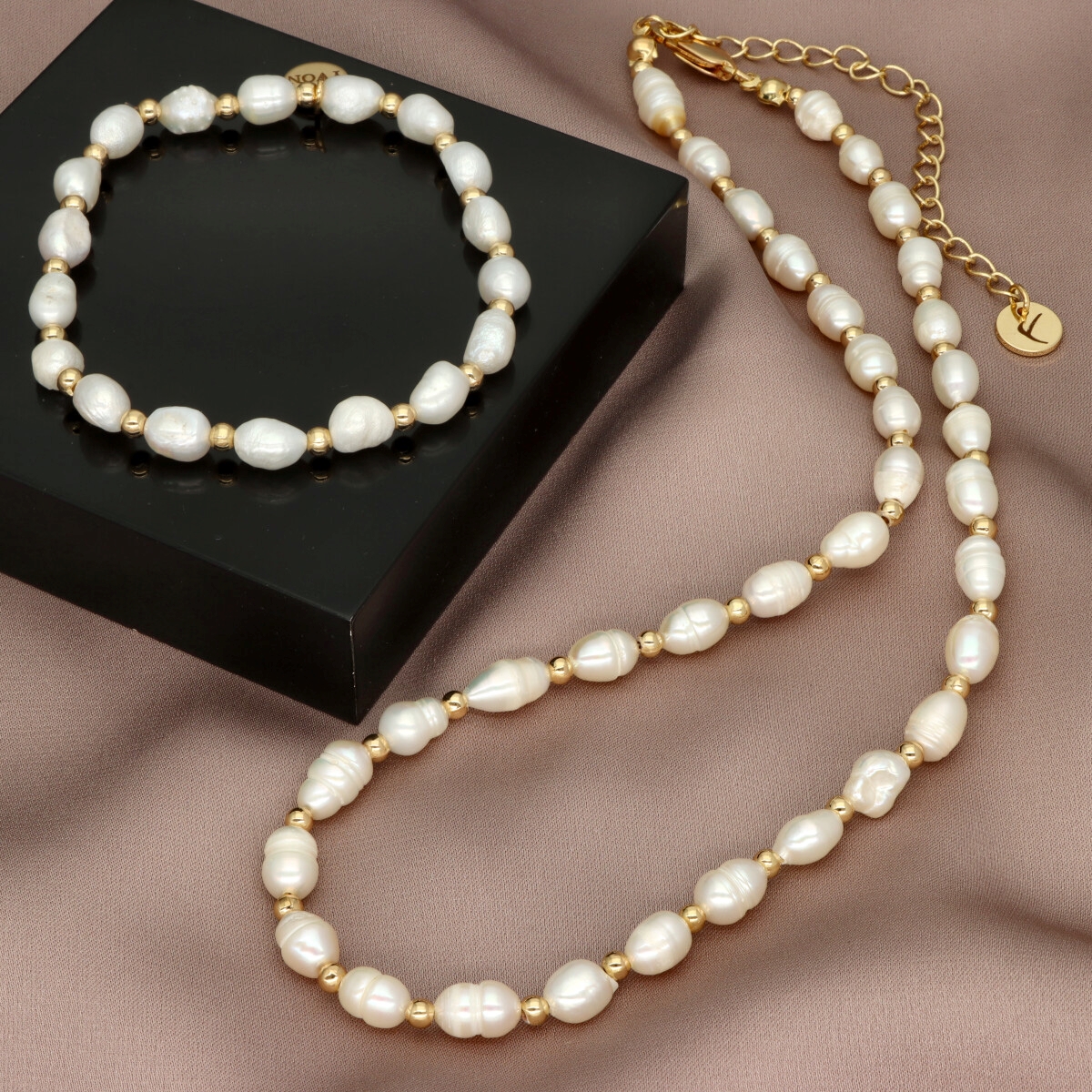 Naszyjnik wykonany z NATURALNYCH PEREŁ SŁODKOWODNYCH o subtelnym, naturalnym połysku. Każda perła różni się kształtem, co podkreśla autentyczny charakter biżuterii.
