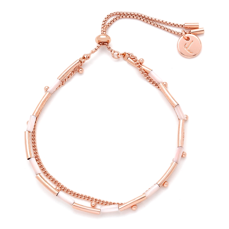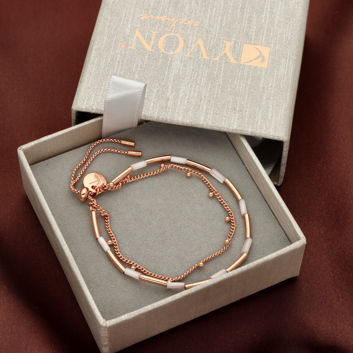 Bransoletka wykonana z mosiądzu pozłacanego różowym złotem, z wstawkami z naturalnej muszli. Delikatna, wielorzędowa forma z drobnymi kuleczkami tworzy efekt lekkiej, kobiecej biżuterii. Model posiada wygodne, przedłużane zapięcie umożliwiające idealne dopasowanie do nadgarstka. Hipoalergiczna, starannie wykonana, zapakowana w eleganckie pudełko YVON Exclusive. Do kompletu dostępny jest naszyjnik o tym samym indeksie numerycznym.
