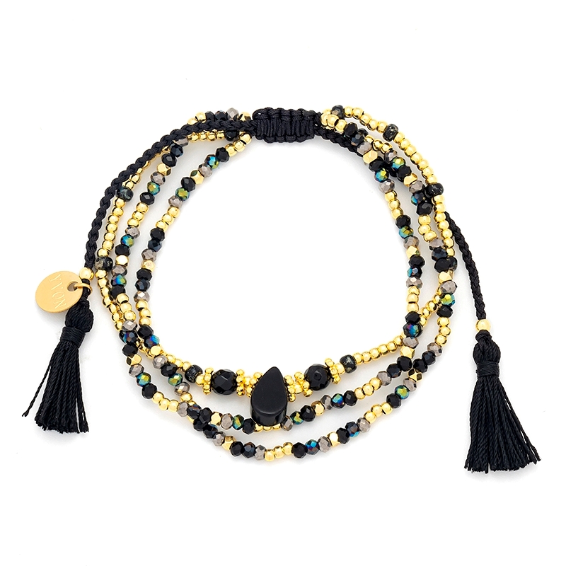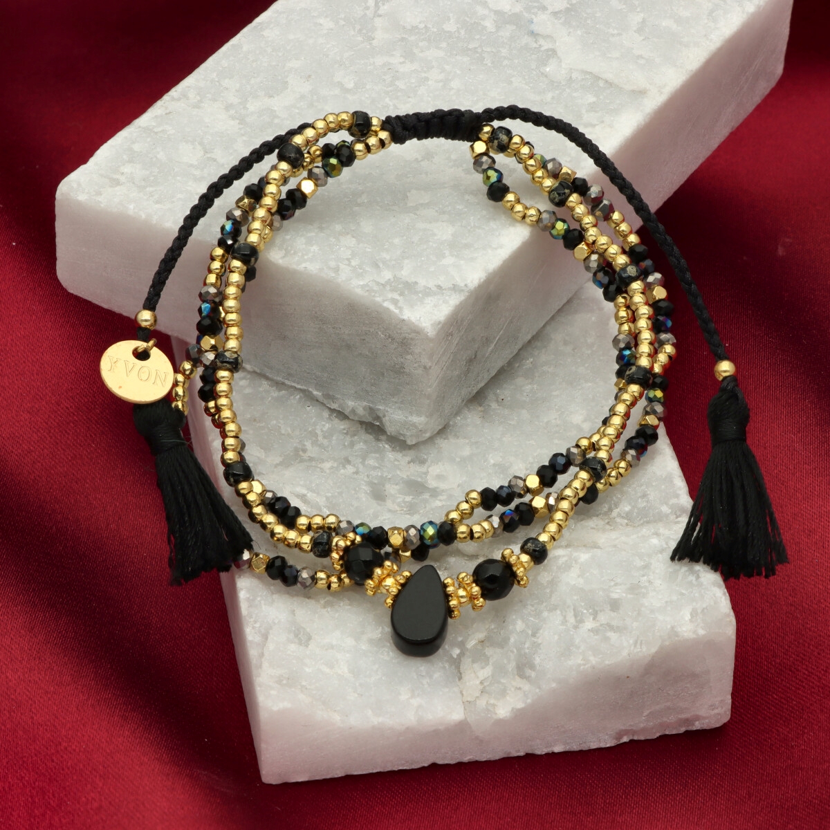 Trzyrzędowa, hipoalergiczna bransoleta wykonana z mosiądzu złoconego 16-karatowym złotem. Ozdobiona naturalnymi kamieniami (SPINEL) i szkłem fasetowanym, które pięknie odbija światło, podkreślając strukturę biżuterii. Model posiada regulowane, zaciągane zapięcie umożliwiające dopasowanie do nadgarstka. Bransoleta łączy wysoką jakość wykonania z eleganckim, ręcznie wykończonym stylem. Zapakowana w pudełko YVON Exclusive – idealna na prezent.
