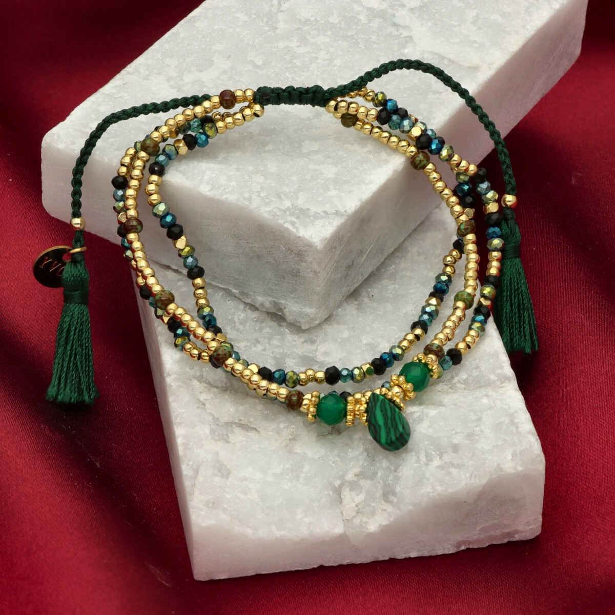 Trzyrzędowa, hipoalergiczna bransoleta wykonana z mosiądzu złoconego 16-karatowym złotem. Ozdobiona naturalnymi kamieniami i szkłem fasetowanym, które pięknie odbija światło, podkreślając strukturę biżuterii. Model posiada regulowane, zaciągane zapięcie umożliwiające dopasowanie do nadgarstka. Bransoleta łączy wysoką jakość wykonania z eleganckim, ręcznie wykończonym stylem. Zapakowana w pudełko YVON Exclusive – idealna na prezent.