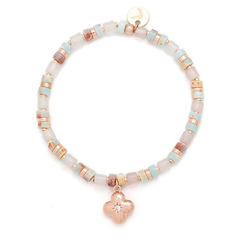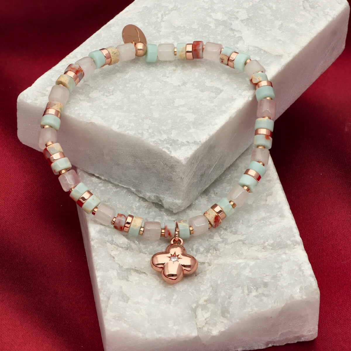 Bransoletka wykonana z mosiądzu złoconego 16-karatowym złotem, ozdobiona naturalnymi kamieniami i szkłem fasetowanym, które subtelnie odbija światło. Centralnym elementem biżuterii jest elegancka zawieszka w kształcie kwiatka z cyrkonią, nadająca całości delikatnego blasku. Starannie wykonana z dbałością o każdy detal, hipoalergiczna i przyjemna w noszeniu. Bransoletka zapakowana w eleganckie pudełko YVON Exclusive – idealna jako prezent lub stylowy dodatek na co dzień.