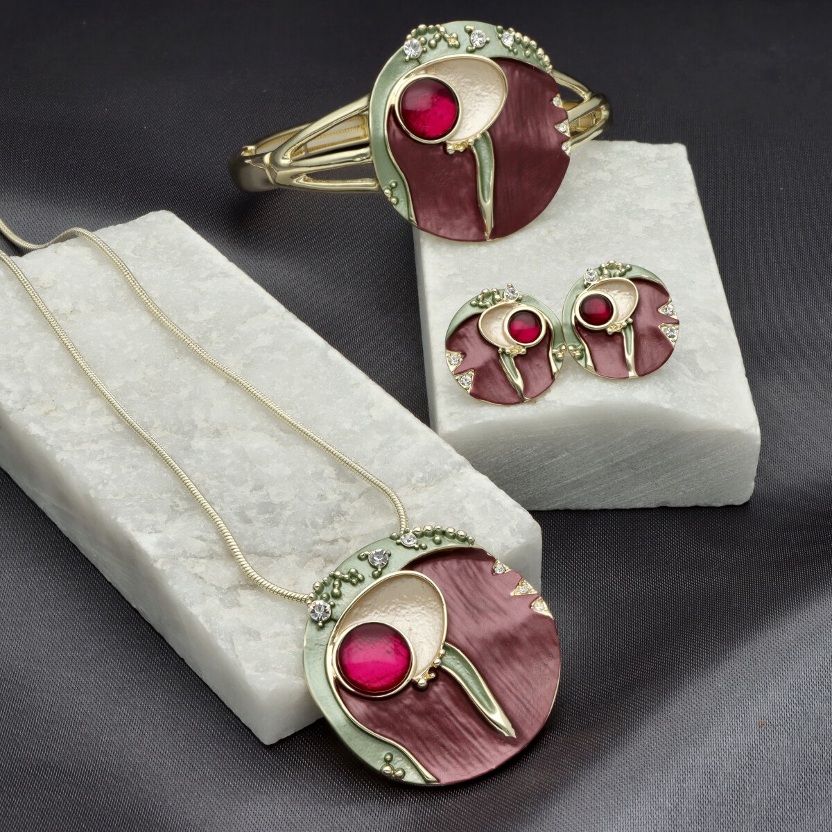 Elegancka bransoletka wykonana z metalu, żywicy jubilerskiej i emalii. Rozmiar uniwersalny (na rozciągliwych gumkach). Szukaj do kompletu naszyjnika i kolczyków o tym samym indeksie numerycznym.