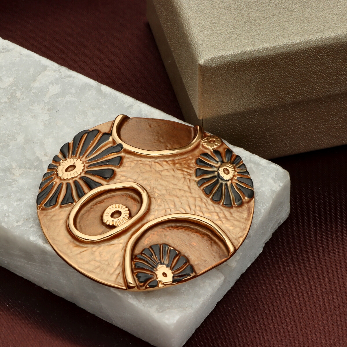 Broszka na magnes z kolekcji YVON biżuteria artystyczna, wykonana z metalu hipoalergicznego i zdobiona ręcznie nanoszoną emalią. Średnica broszki ok. 5 cm. Mocny magnes umożliwia przypięcie bez ryzyka uszkodzenia tkaniny – idealna do płaszczy, szali i torebek. Każdy egzemplarz pakowany jest w eleganckie pudełko prezentowe YVON.