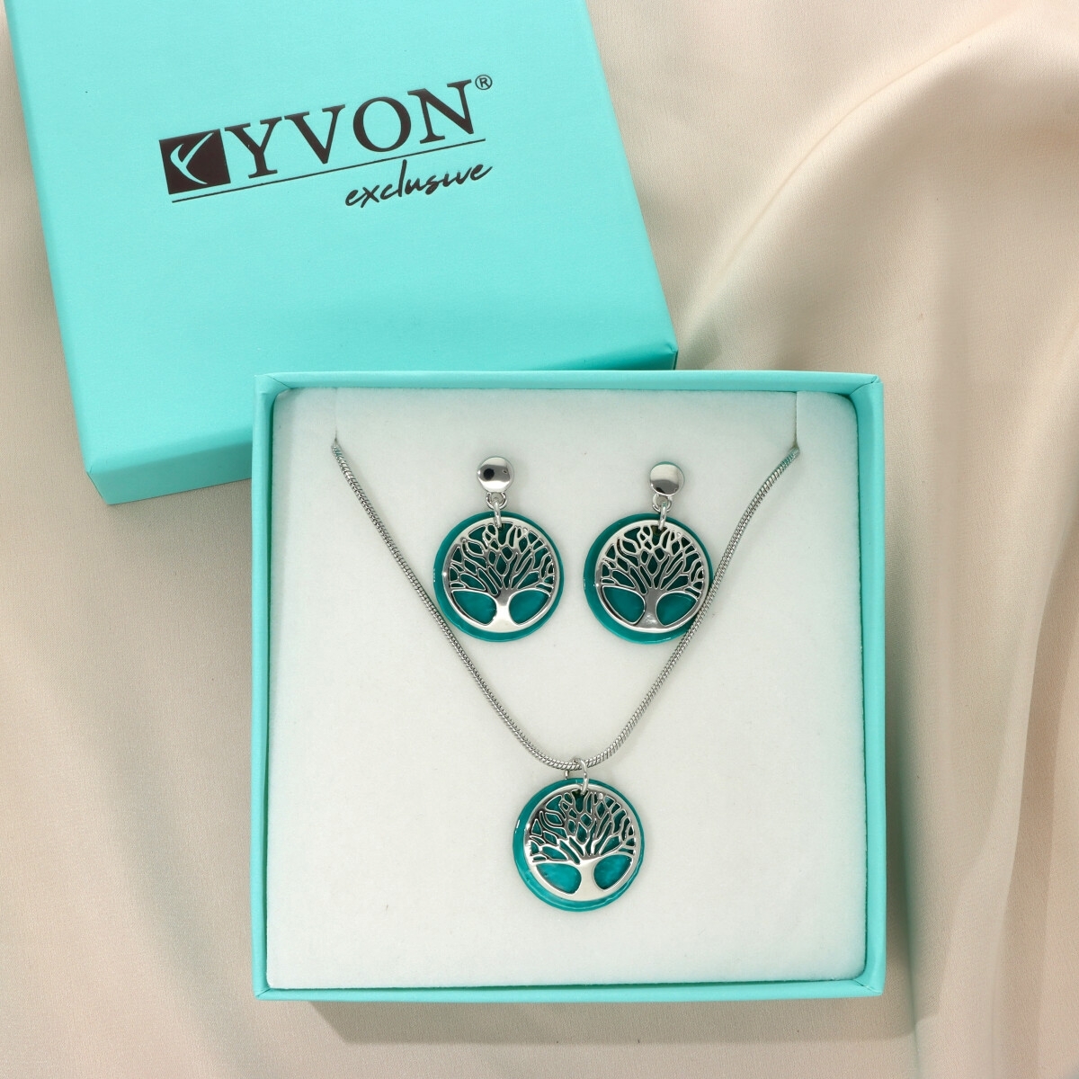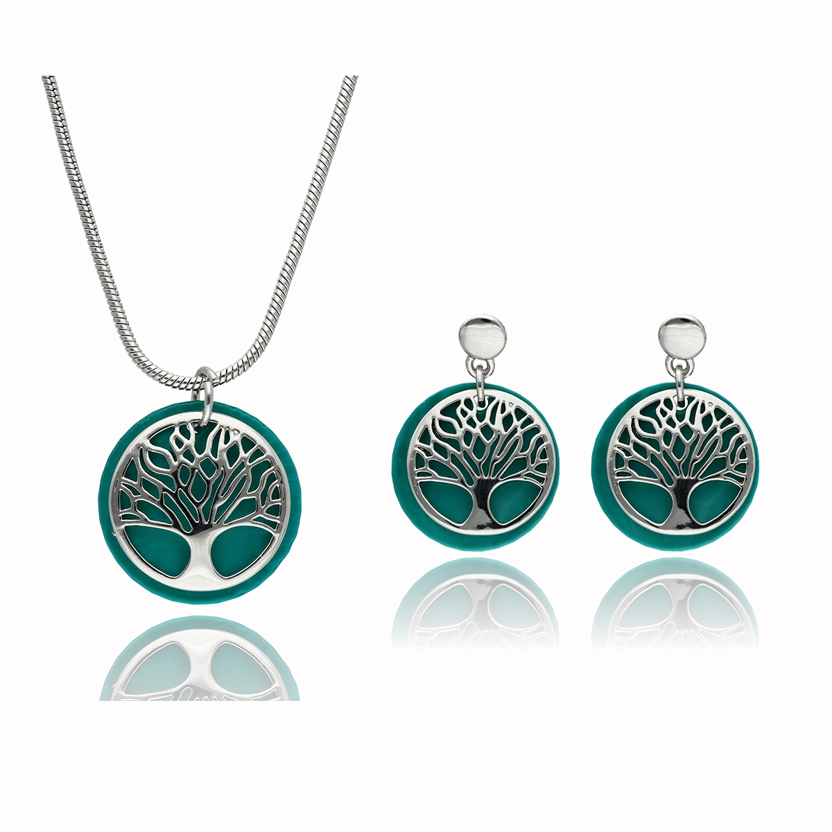 Komplet biżuterii składający się z naszyjnika oraz kolczyków, zapakowany w pudełko prezentowe. Wykonany z hipoalergicznego metalu oraz muszli naturalnej barwionej. Lekka forma zapewnia komfort codziennego użytkowania. Długość naszyjnika wynosi 42 cm, dodatkowo 8 cm zawieszki. Długość kolczyków to około 3 cm. Pudełko prezentowe w zestawie.