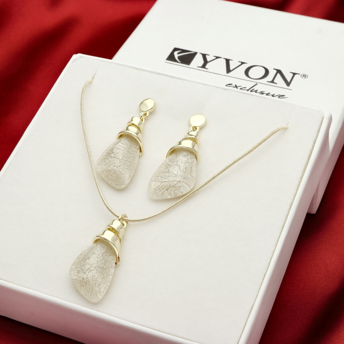 Komplet biżuterii składający się z naszyjnika oraz kolczyków, zapakowany w pudełko prezentowe. Wykonany z hipoalergicznego metalu oraz żywicy jubilerskiej. Lekka forma zapewnia komfort codziennego użytkowania. Długość naszyjnika wynosi 42 cm, dodatkowo 8 cm zawieszki. Długość kolczyków to około 3 cm. Specyfikacja: zestaw: naszyjnik + kolczyki materiał: hipoalergiczny metal, żywica jubilerska długość naszyjnika: 42 cm + 8 cm zawieszka długość kolczyków: ok. 3 cm pudełko prezentowe w zestawie