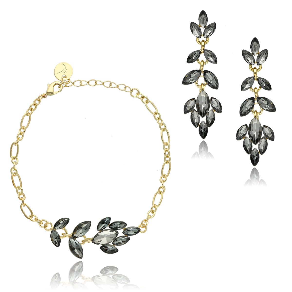 Uroczy, niezwykle kobiecy zestaw biżuterii wizytowej, który subtelnie podkreśla elegancję stylizacji. Komplet składa się z regulowanej bransoletki oraz efektownych kolczyków o długości 6 cm, które pięknie wysmuklają szyję i dodają lekkości całej sylwetce.