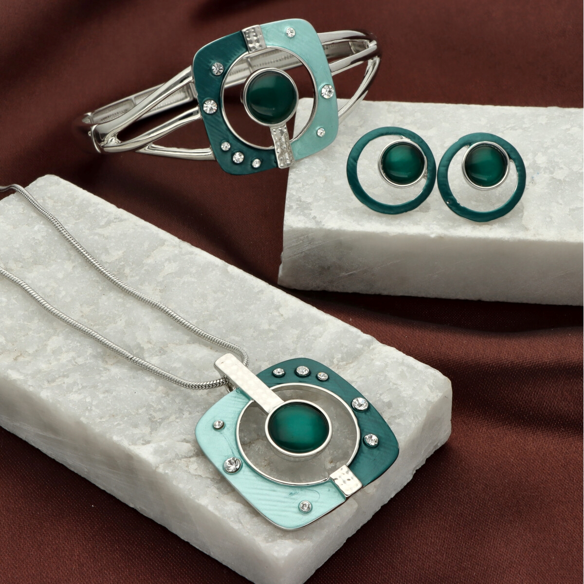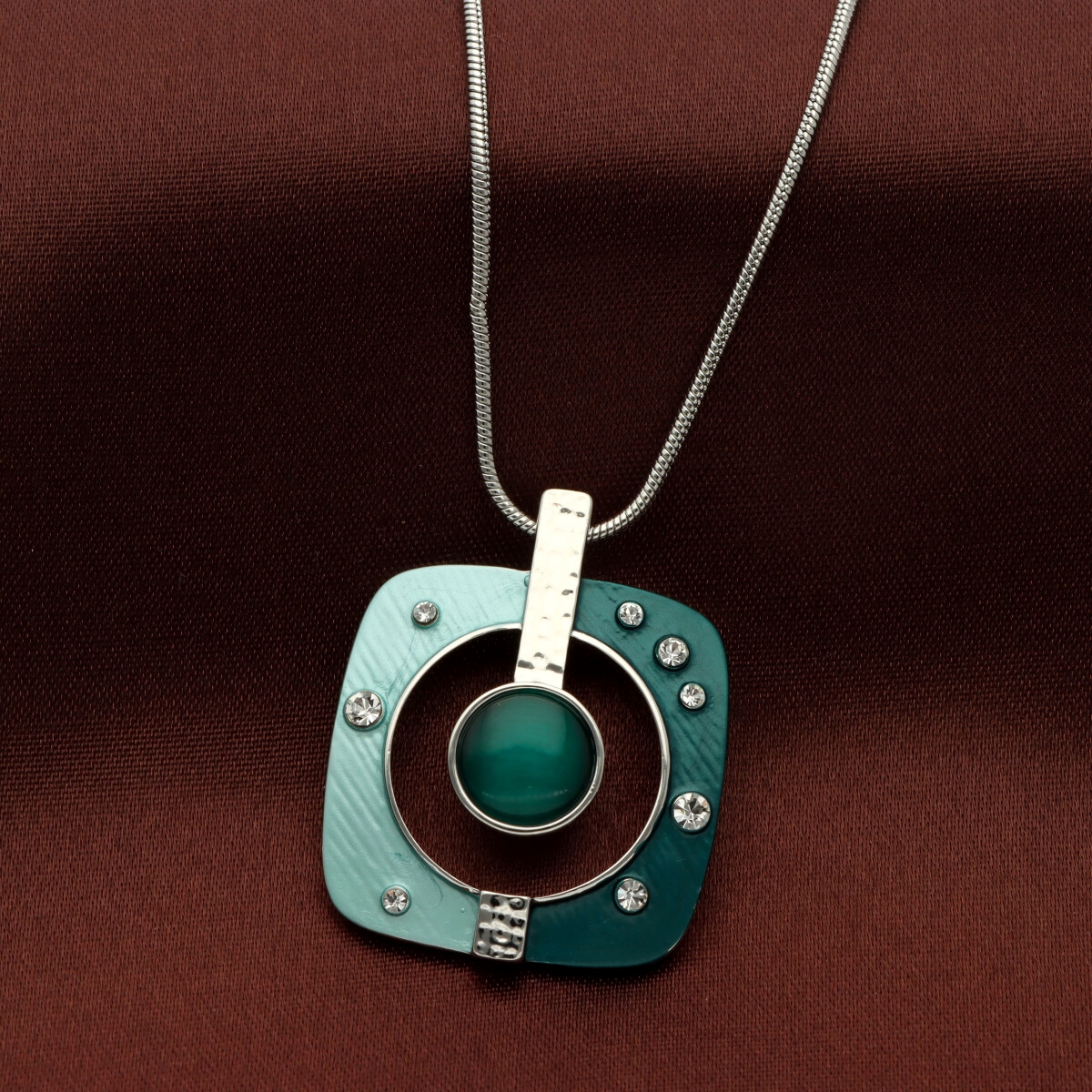 Uroczy, dekoltowy naszyjnik wykonany z antyalergicznego metalu, kwarcu i kolorowej emalii. Długość 45 cm + 8 cm regulacja. Szukaj do kompletu bransoletki i kolczyków o tym samym indeksie numerycznym.