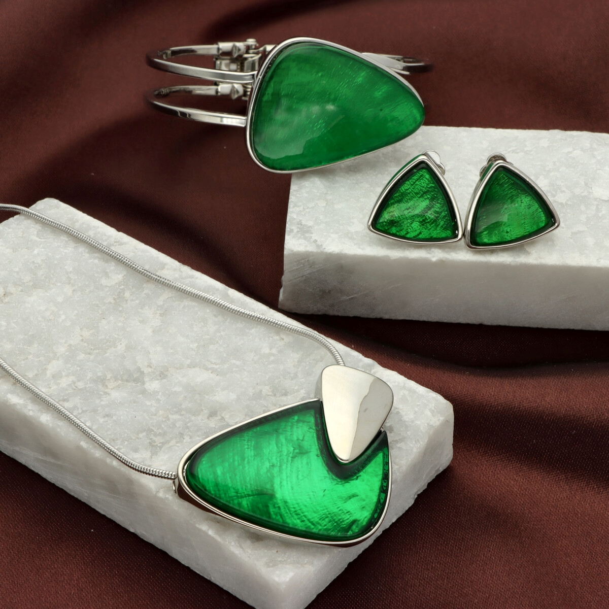Efektowny dekoltowy naszyjnik wykonany z antyalergicznego metalu i kolorowej żywicy. Długość 45 cm + 8 cm regulacja. Szukaj do kompletu bransoletki i kolczyków o tym samym indeksie numerycznym.