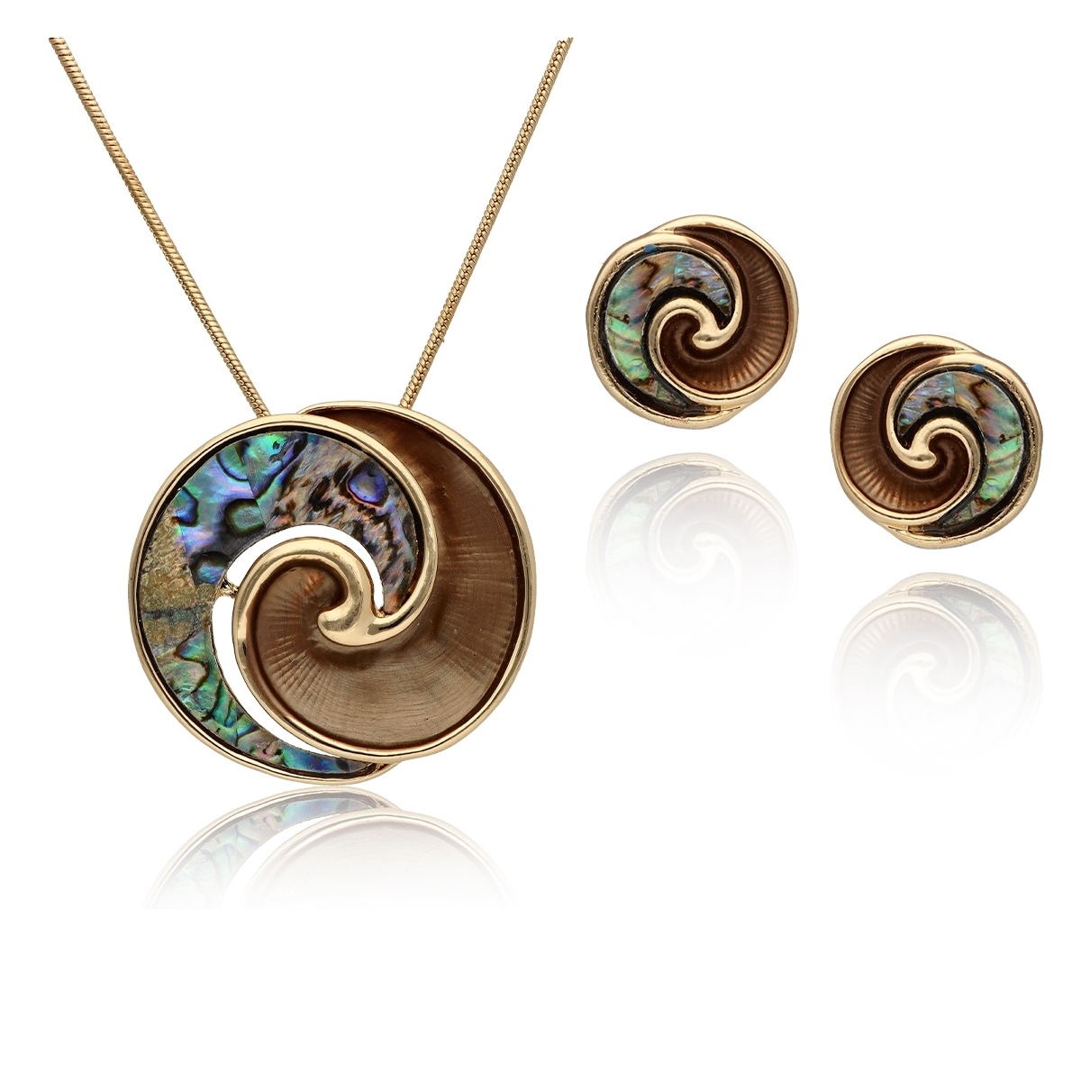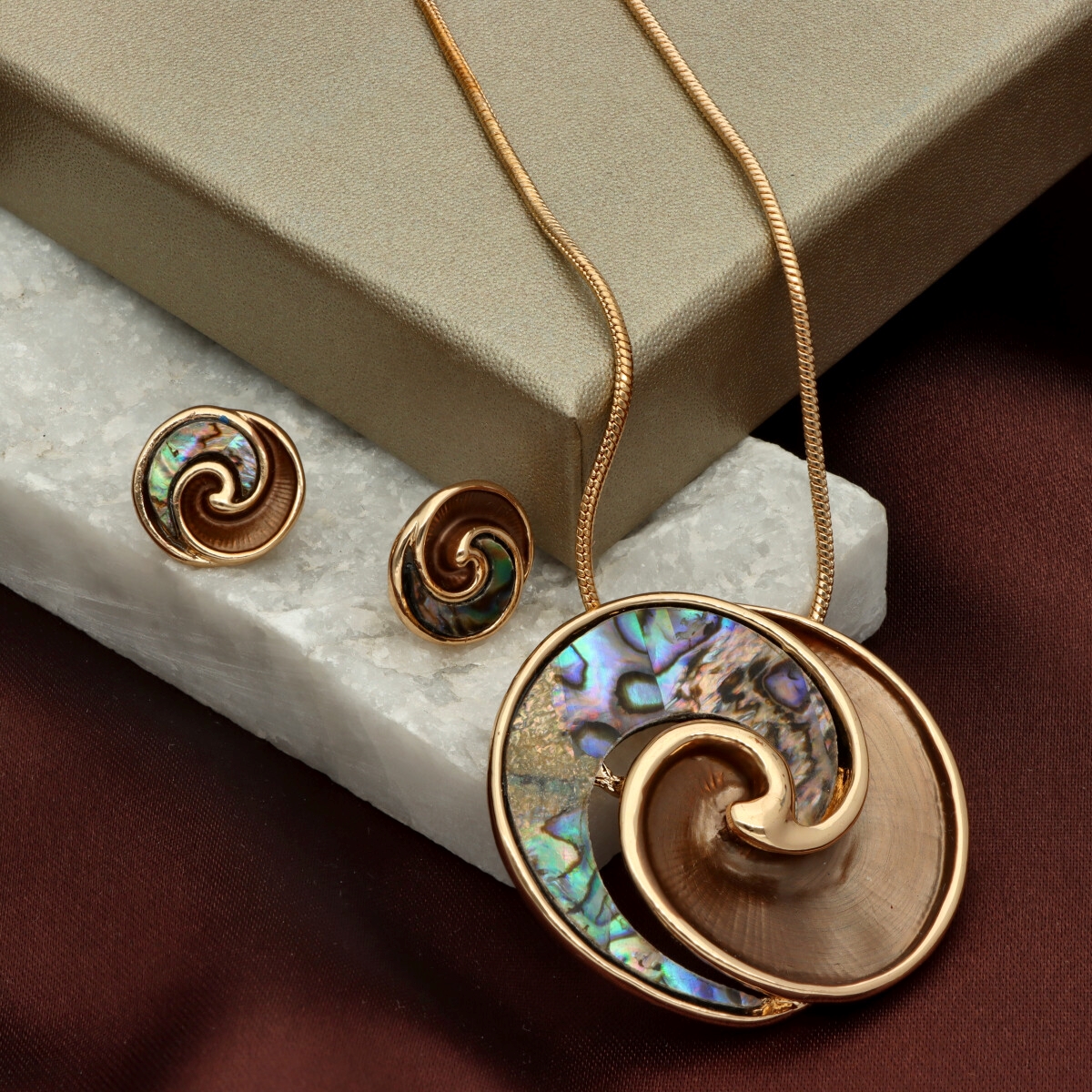 Komplet z kolekcji YVON BIŻUTERIA ARTYSTYCZNA, wykonany z metalu hipoalergicznego. Zdobiony emaliowanymi elementami i muszlą naturalną ABALONE, które tworzą elegancką, harmonijną kompozycję. Naszyjnik o długości 42 cm z możliwością regulacji o dodatkowe 8 cm, idealnie układa się na dekolcie. Kolczyki na wygodnym zapięciu typu sztyft. Całość zapakowana w eleganckie pudełko prezentowe YVON. To wyjątkowy komplet, który podkreśla kobiecą klasę i artystyczne wyczucie stylu.