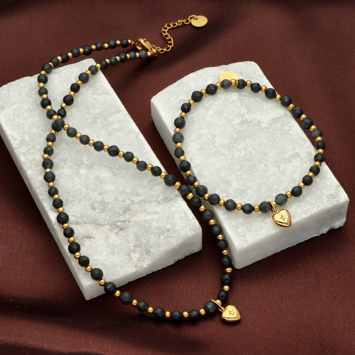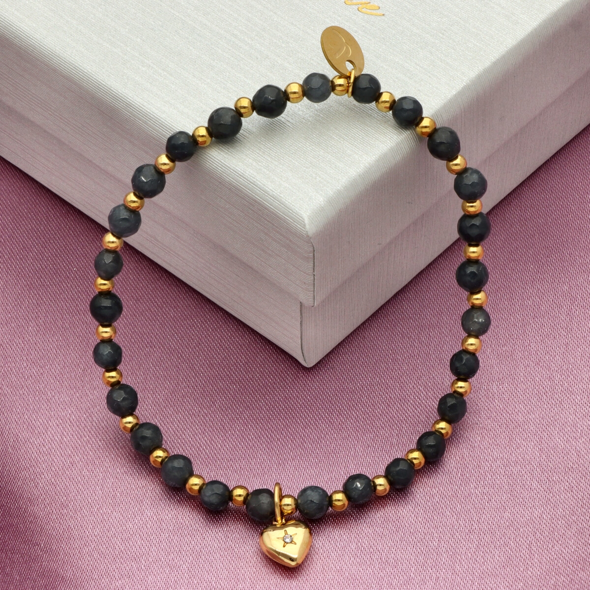 Delikatna bransoletka wykonana z agatu i kryształów, uzupełniona pozłacaną stalą szlachetną. Kamienie dodają całości głębi, a eleganckie złocenie subtelnie podkreśla kobiecy styl.
