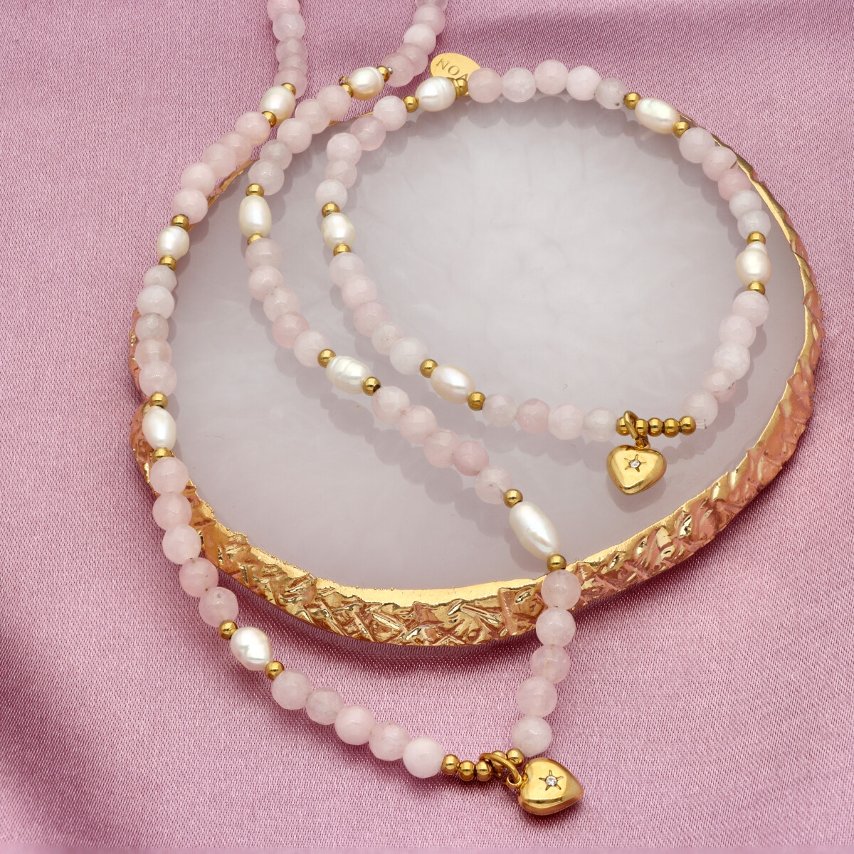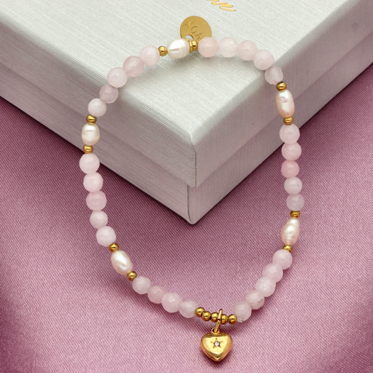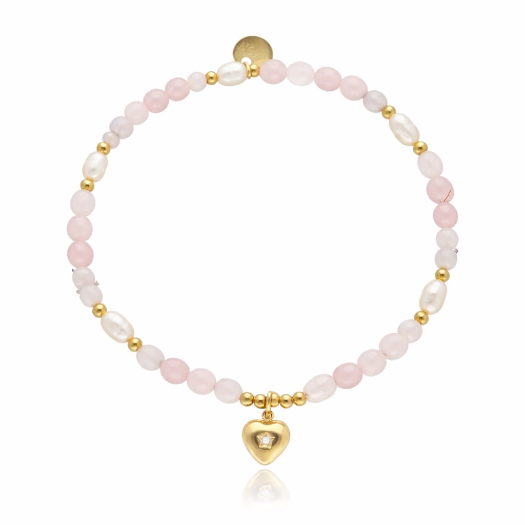 Delikatna bransoletka wykonana z kwarcu różowego i pereł naturalnych, uzupełniona pozłacaną stalą szlachetną. Kamienie dodają całości głębi, a eleganckie złocenie subtelnie podkreśla kobiecy styl.