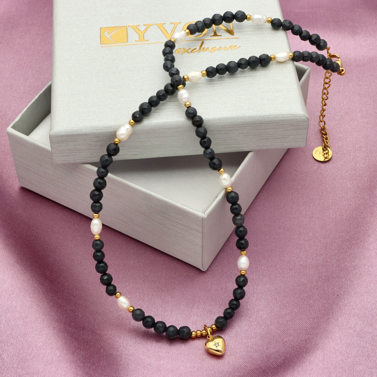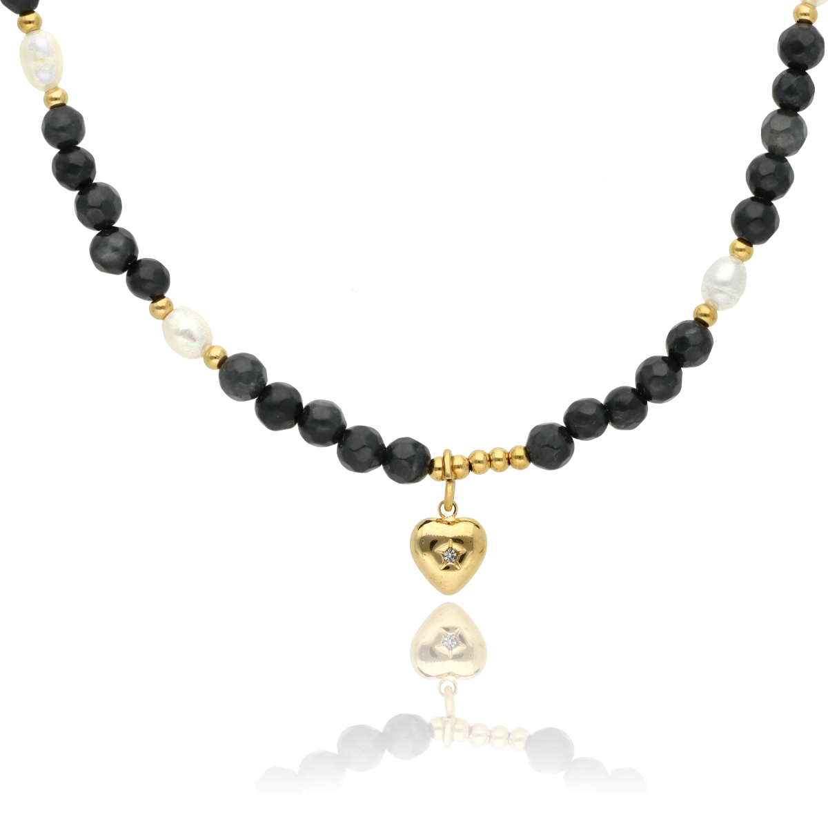 Zjawiskowy naszyjnik wykonany z pozłacanej stali szlachetnej, agatu i pereł naturalnych. Połączenie elegancji z subtelną energią kamieni sprawia, że naszyjnik idealnie dopełnia zarówno codzienne, jak i wieczorowe stylizacje. Długość 40 cm + 5 cm regulacji umożliwia dopasowanie do różnych dekoltów.