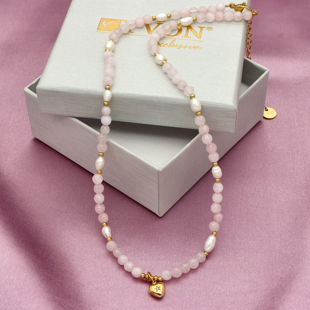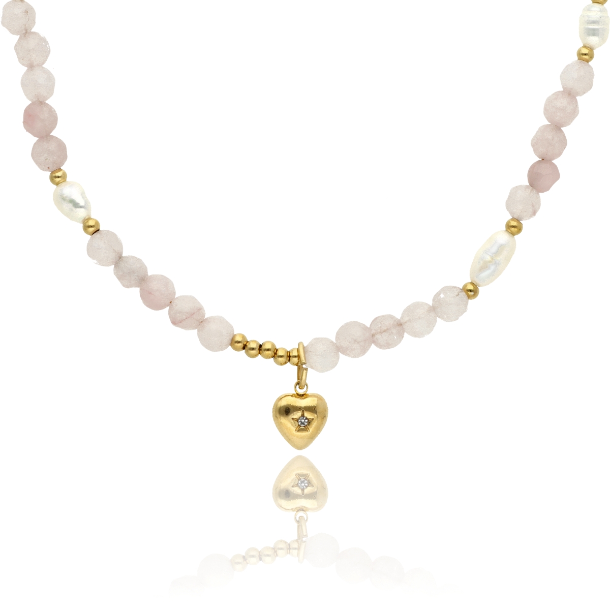 Zjawiskowy naszyjnik wykonany z pozłacanej stali szlachetnej, kwarcu różowego i pereł naturalnych. Połączenie elegancji z subtelną energią kamieni sprawia, że naszyjnik idealnie dopełnia zarówno codzienne, jak i wieczorowe stylizacje. Długość 40 cm + 5 cm regulacji umożliwia dopasowanie do różnych dekoltów.