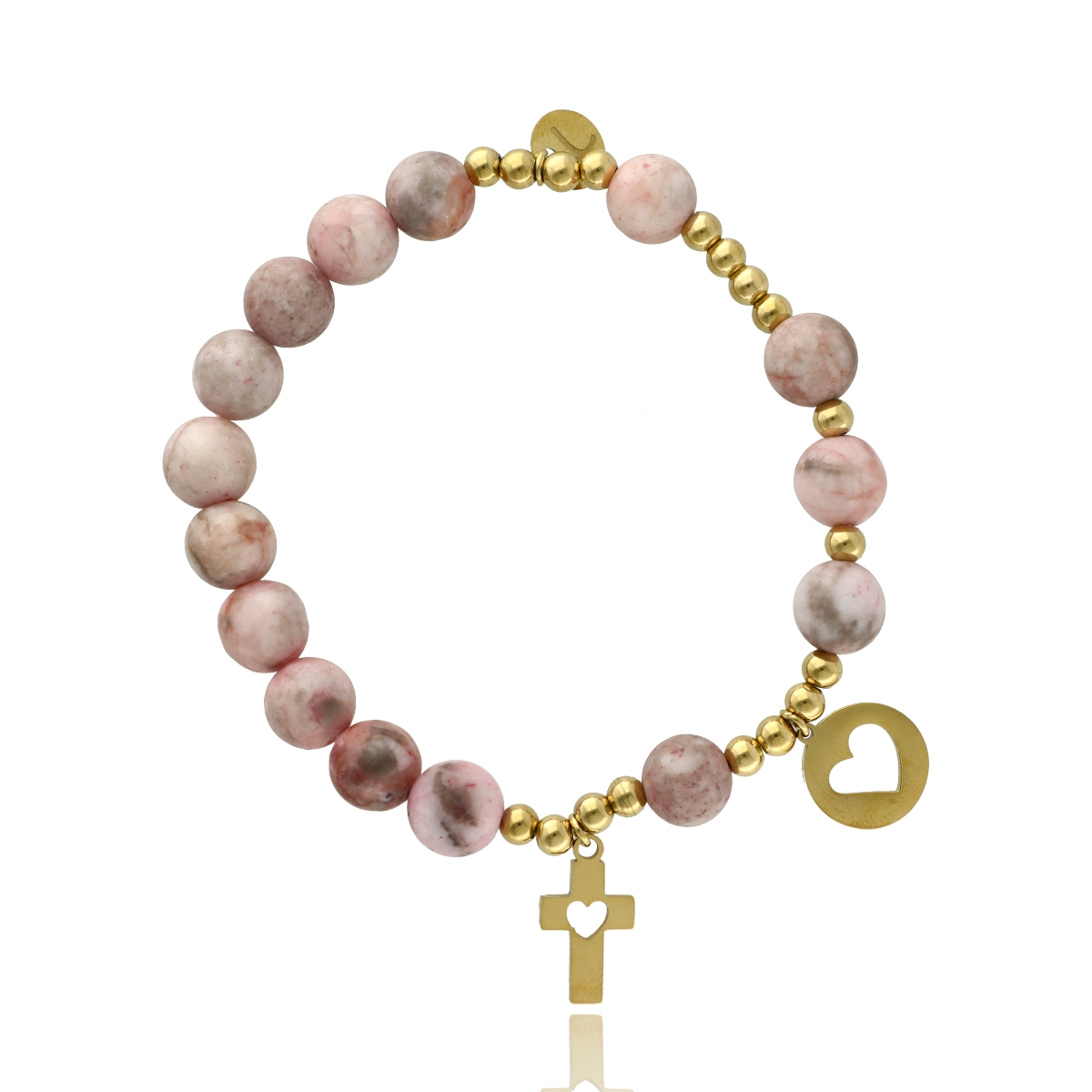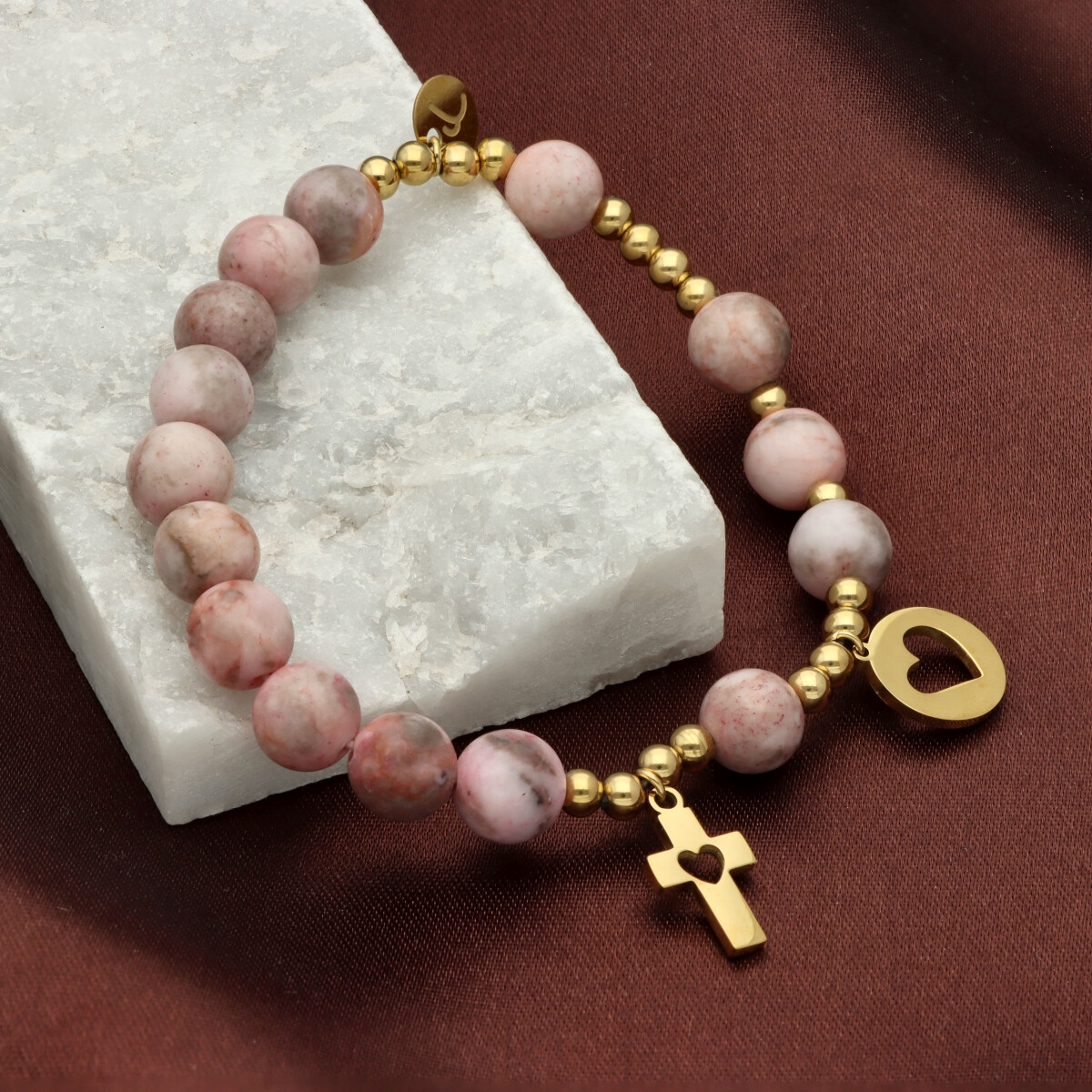 Różaniec wykonany z naturalnych kamieni (RÓŻOWY OPAL PUDROWY) oraz ze stali szlachetnej 316L, złoconej trwałą metodą PVD. To elegancka, solidna biżuteria o ponadczasowym charakterze — idealna jako osobista ozdoba lub prezent.