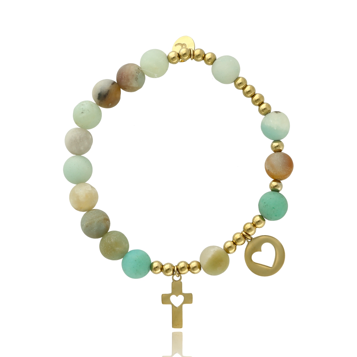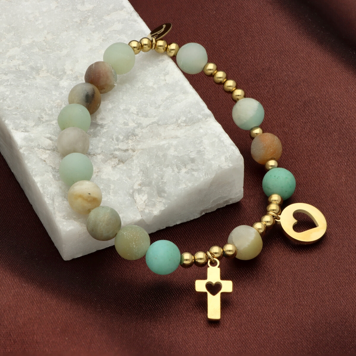 Różaniec wykonany z naturalnych kamieni (AMAZONIT) oraz ze stali szlachetnej 316L, złoconej trwałą metodą PVD. To elegancka, solidna biżuteria o ponadczasowym charakterze — idealna jako osobista ozdoba lub prezent.