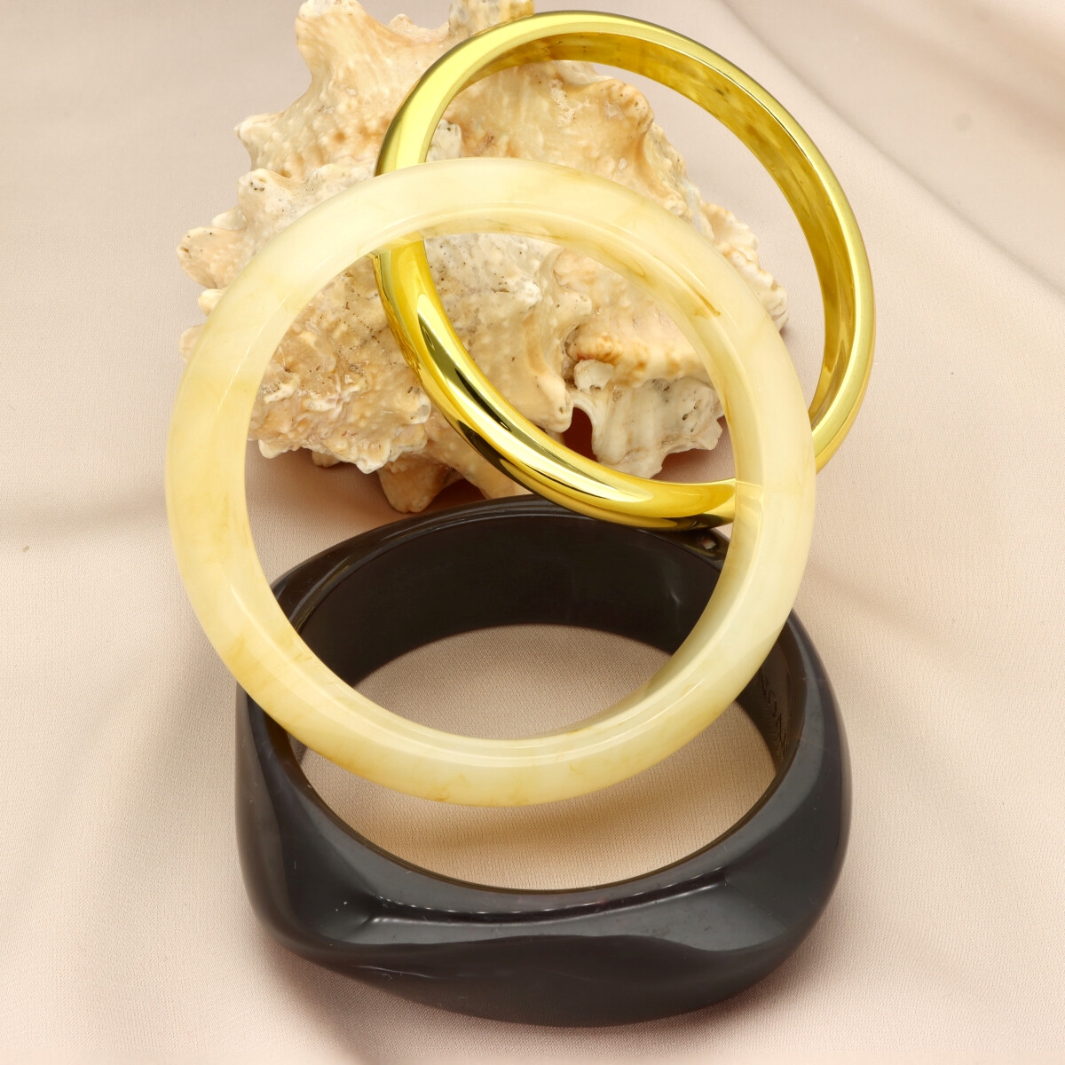 Zestawy bransolet YVON to wyraz nowoczesnej elegancji w wyjątkowo dopracowanej formie. Połączenie gładkiego, złotego metalu z dekoracyjną żywicą o subtelnym, marmurkowym efekcie tworzy kompozycję, która przyciąga uwagę, a jednocześnie pozostaje ponadczasowa. Każdy komplet został zaprojektowany tak, aby tworzyć spójną, stylową całość – różnorodność form i faktur nadaje bransoletkom unikatowego charakteru, a stonowana, klasyczna kolorystyka sprawia, że pasują zarówno do codziennych stylizacji, jak i bardziej eleganckich zestawień. Bransoletki wykonane są z metalu hipoalergicznego (zamak) oraz wysokiej jakości żywicy, dzięki czemu są komfortowe w noszeniu i przyjazne dla skóry. Standardowa średnica 6,5 cm zapewnia dobre dopasowanie do nadgarstka. Zestaw obejmuje wszystkie bransoletki widoczne na zdjęciu, tworząc gotową stylizację, która nie wymaga już żadnych dodatków – to biżuteria, która sama buduje cały look i nadaje mu wyrazistości.