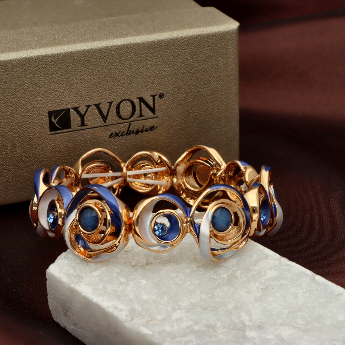 Bransoleta z kolekcji YVON BIŻUTERIA ARTYSTYCZNA, wykonana z metalu hipoalergicznego i zdobiona emaliowanymi elementami. Konstrukcja oparta na elastycznych gumeczkach dopasowuje się do każdego nadgarstka, zapewniając komfort noszenia. Wykończona z dbałością o detale, zachwyca artystycznym wzornictwem. Zapakowana w eleganckie pudełko prezentowe YVON – doskonały wybór zarówno do codziennych, jak i wieczorowych stylizacji.