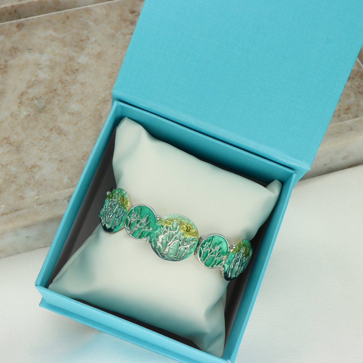 Bransoletka wykonana w konwencji biżuterii artystycznej. Ręcznie emaliowana. Rozmiar uniwersalny. Całość wykonana z antyalergicznego metalu. W eleganckim pudełku. Szukaj do kompletu naszyjnika, kolczyków i broszki na magnes o tym samym indeksie numerycznym.