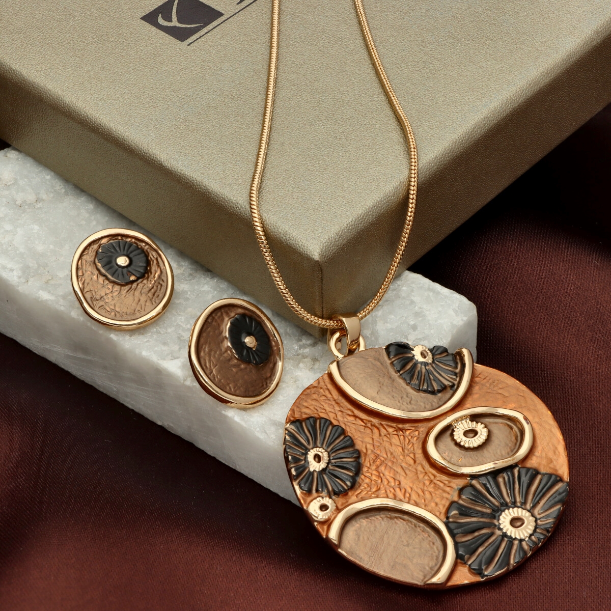 Komplet z kolekcji YVON biżuteria artystyczna, wykonany z metalu hipoalergicznego, pozbawionego niklu i ołowiu. Zdobiony emaliowanymi elementami, które tworzą elegancką, harmonijną kompozycję. Naszyjnik o długości 42 cm z możliwością regulacji o dodatkowe 8 cm, idealnie układa się na dekolcie. Kolczyki na wygodnym zapięciu typu sztyft. Całość zapakowana w eleganckie pudełko prezentowe YVON. To wyjątkowy komplet, który podkreśla kobiecą klasę i artystyczne wyczucie stylu.