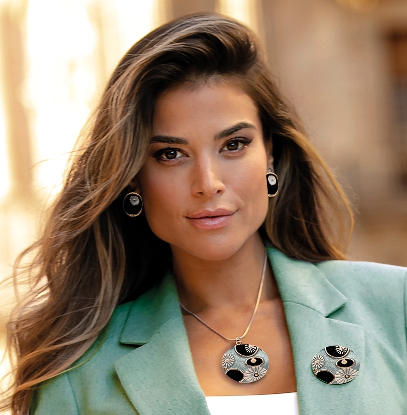 Komplet z kolekcji YVON biżuteria artystyczna, wykonany z metalu hipoalergicznego, pozbawionego niklu i ołowiu. Zdobiony emaliowanymi elementami, które tworzą elegancką, harmonijną kompozycję. Naszyjnik o długości 42 cm z możliwością regulacji o dodatkowe 8 cm, idealnie układa się na dekolcie. Kolczyki na wygodnym zapięciu typu sztyft. Całość zapakowana w eleganckie pudełko prezentowe YVON. To wyjątkowy komplet, który podkreśla kobiecą klasę i artystyczne wyczucie stylu.
