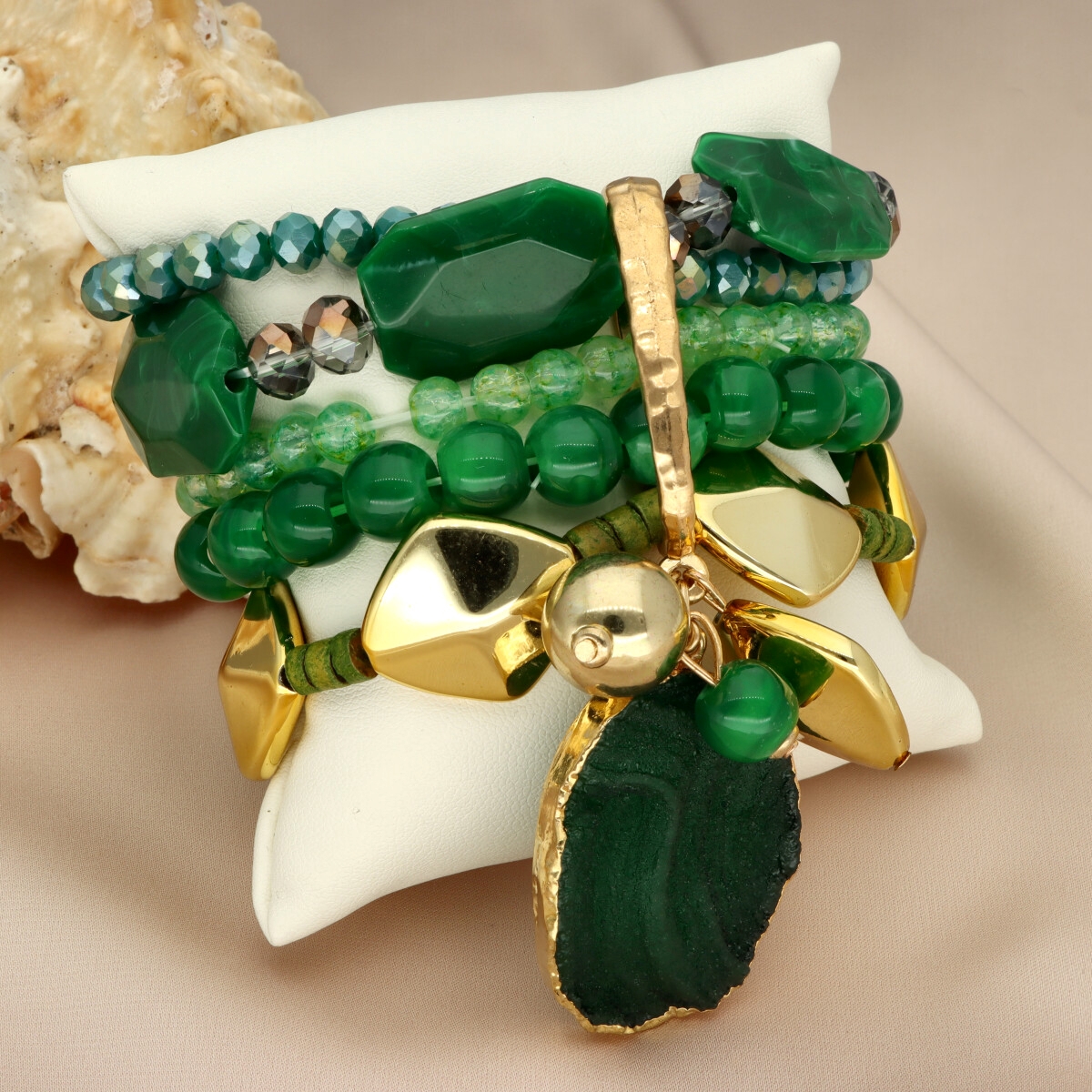 Efektowna, wielorzędowa bransoleta YVON to propozycja dla kobiet, które lubią wyrazistą i niebanalną biżuterię. Ten model zachwyca bogactwem form i struktur – łączy w sobie metal w kolorze złotym, szkło fasetowane, elementy drewniane oraz naturalne kamienie, takie jak marmur zielony żyłkowany.
