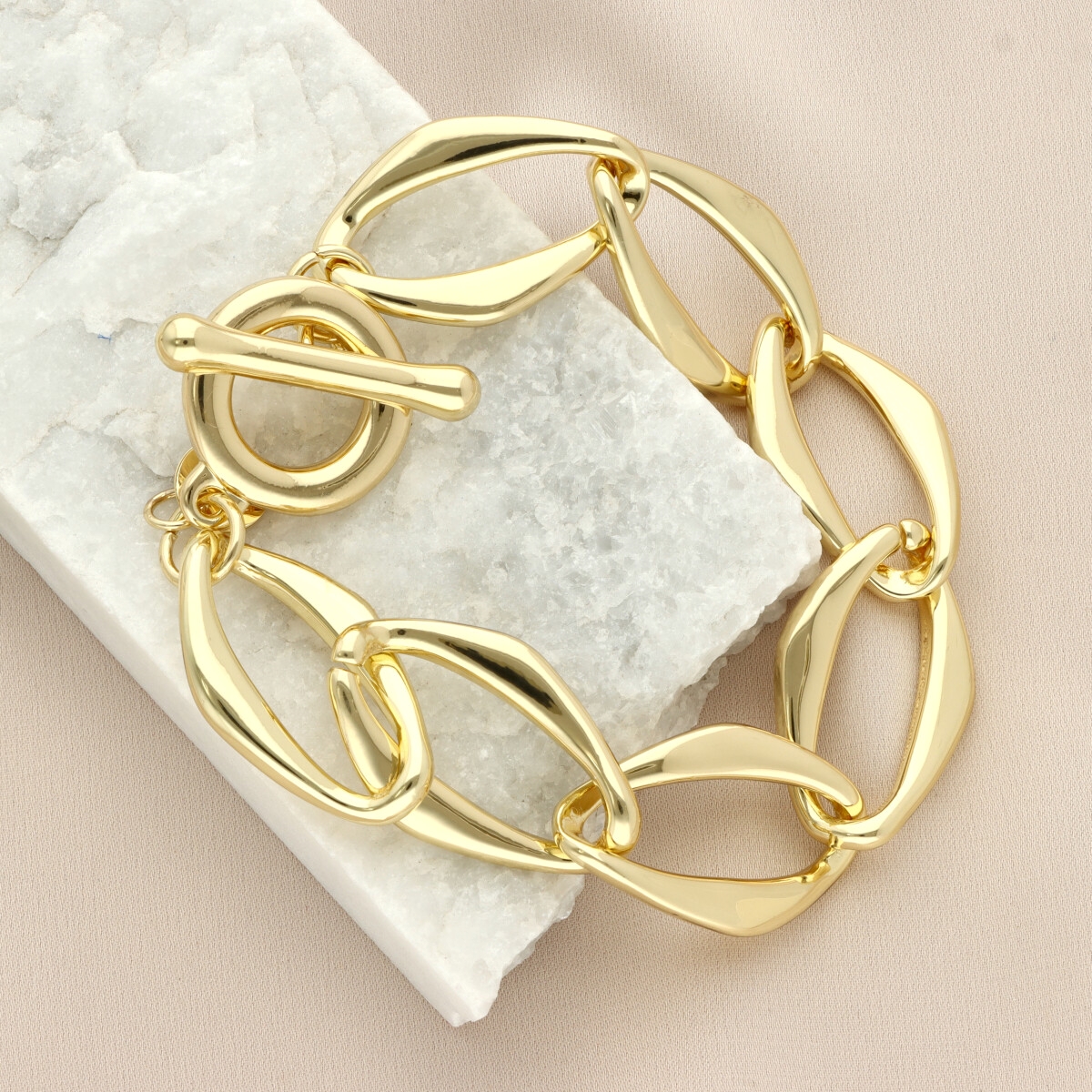 Opis produktu: Stylowa bransoletka o nowoczesnej formie, wykonana z wysokiej jakości hipoalergicznego metalu (zamak – stop cynku), który zapewnia komfort użytkowania i trwałość. Wykończenie w modnym odcieniu light gold nadaje jej elegancki, a jednocześnie lekki i świeży charakter. To subtelniejsza, bardziej współczesna odsłona złota, inspirowana włoskim stylem biżuterii, który łączy wyraziste formy z ponadczasową elegancją. Dekoracyjne ogniwa tworzą efektowną kompozycję, dzięki której bransoletka pięknie prezentuje się na nadgarstku i stanowi mocny, ale stylowy akcent każdej stylizacji. Do bransoletki przewidziany jest pasujący naszyjnik o tym samym indeksie, dzięki czemu możesz stworzyć spójny komplet. Długość bransoletki: 18 cm Materiał: metal hipoalergiczny (zamak)