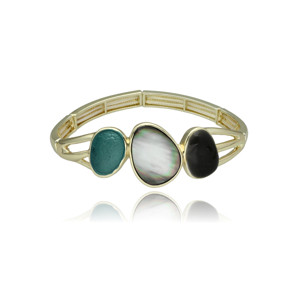 Bransoletka z ozdobnym, 3-elementowym motywem o nieregularnych, płynnych kształtach, wykonana na rozciągliwych gumkach, co zapewnia wygodę noszenia i naturalne dopasowanie do nadgarstka.