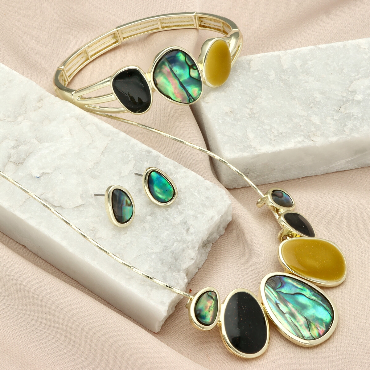 Bransoletka z ozdobnym, 3-elementowym motywem o nieregularnych, płynnych kształtach, wykonana na rozciągliwych gumkach, co zapewnia wygodę noszenia i naturalne dopasowanie do nadgarstka.